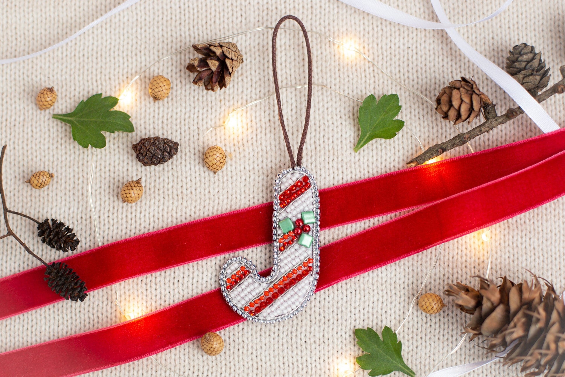 Do you like candies? Here is a delicious bead embroidery kit of white and red candy cone brooch. The needlework pattern of sweet mini food will look perfect as a Christmas dress accessory for a teen girl. The candy cone beadwork tutorial is a great craft kit for kids. The rhinestone jewelry looks fantastic as an Xmas tree ornament or pendant. The original winter jewelry speaks of the originality and unusual personality of the owner. We invite you to let go of your imagination and give yourself new accents of individuality by mastering the art of creating an exclusive beaded accessory. The kit includes a beadwork pattern, detailed instructions, and all the necessary materials. These exclusive DIY sets will become your holiday.