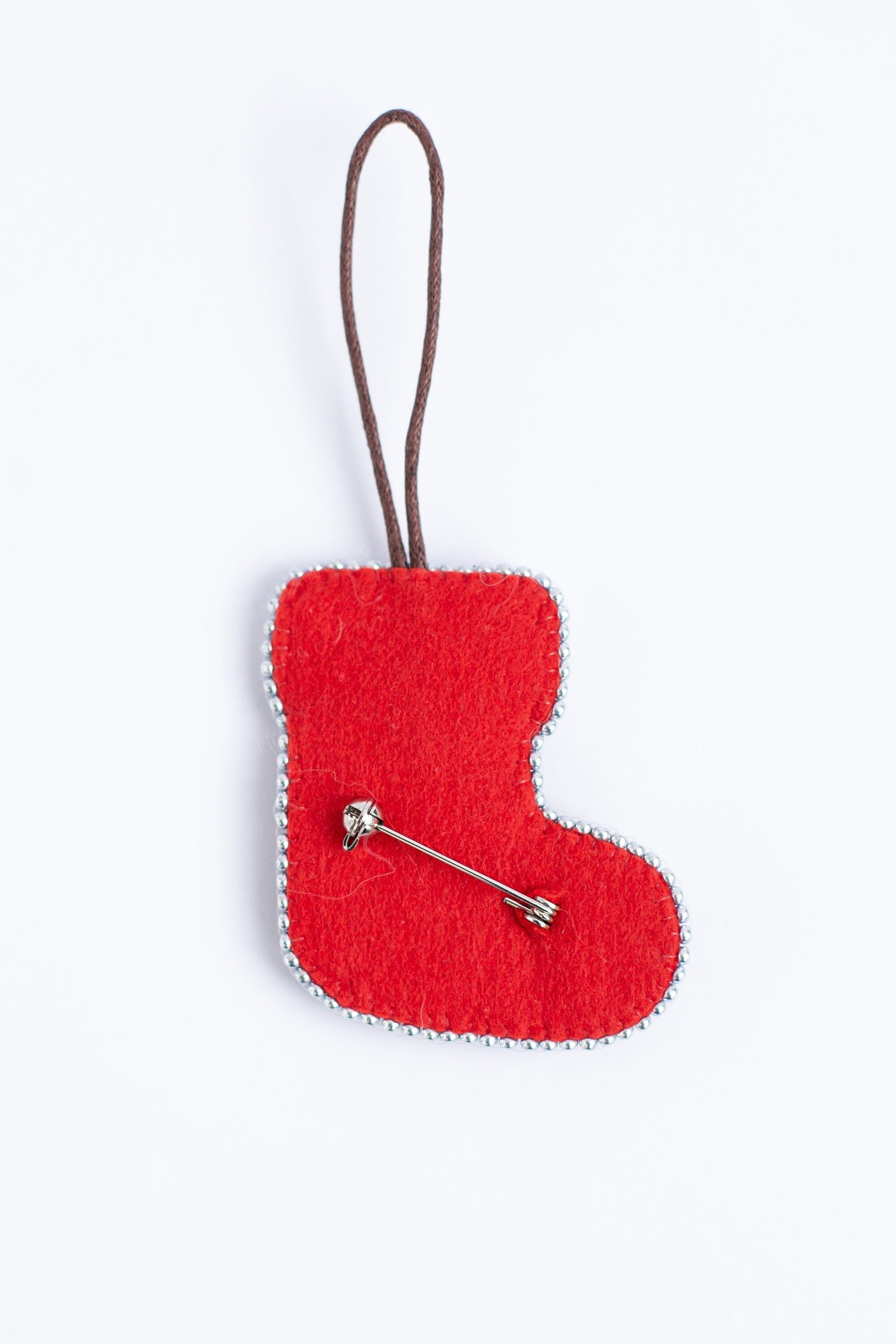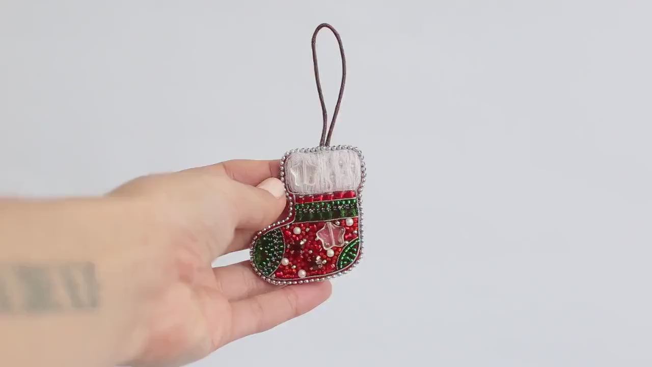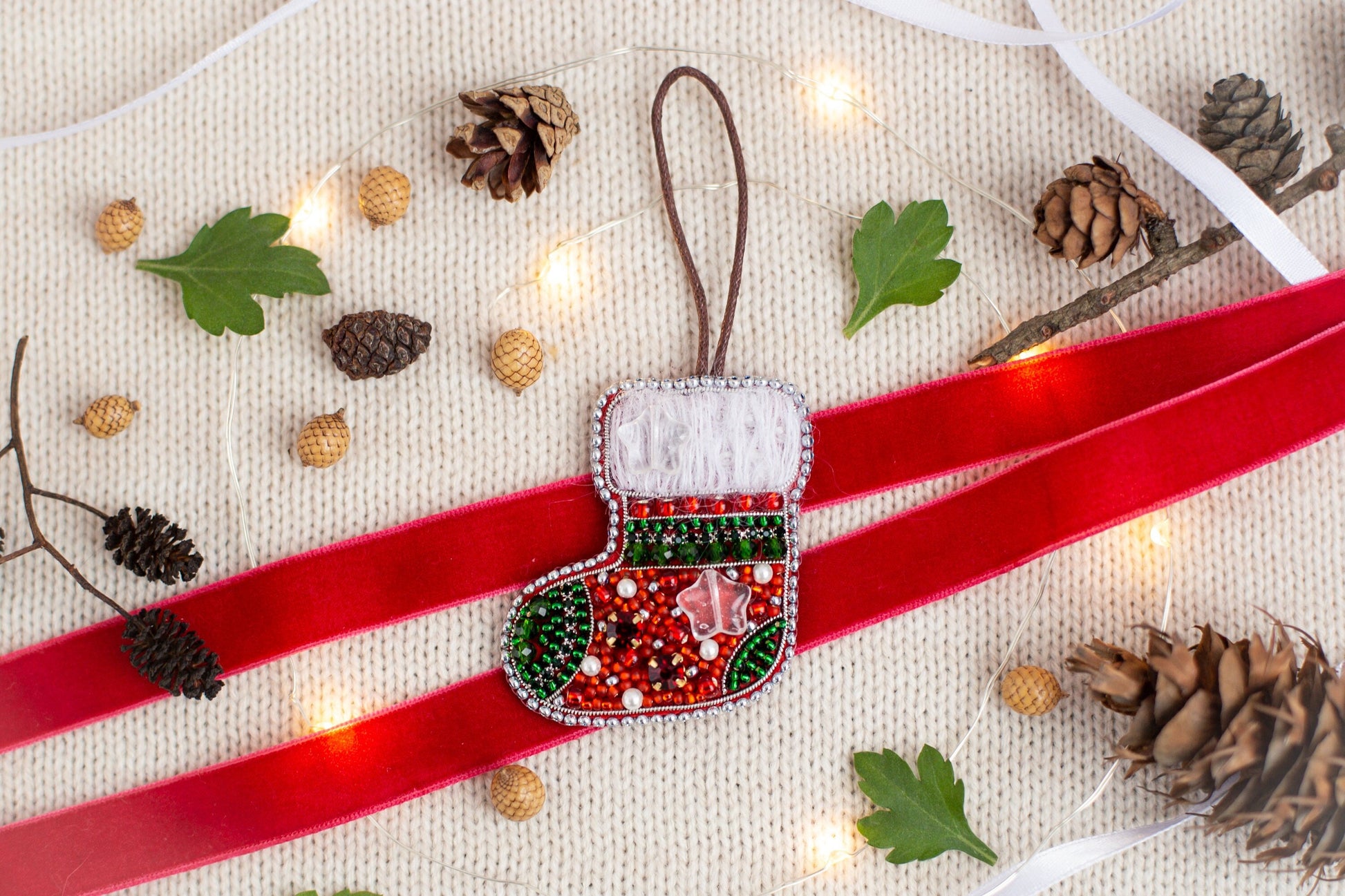 In recent years, in addition to the usual snowflakes, Xmas trees, and snowmen, another Christmas symbol has gained immense popularity: Xmas stockings. If you also want to decorate your holiday dress or coat with this red Christmas brooch, you will need a jewelry-making kit in which we will reveal the secrets of sewing them. This beadwork embroidery pattern will be a fabulous craft set for adults and kids, a perfect Secret Santa gift. The funny winter brooch looks unique and unforgettable. The kit includes a beadwork pattern, detailed instructions, and all the necessary materials.