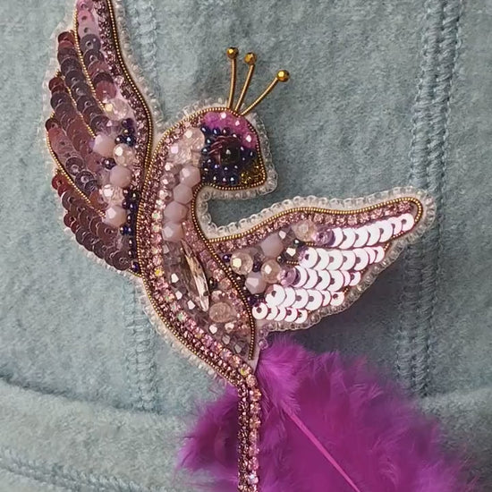 This beaded brooch is a stunning purple bird brooch that combines delicate beadwork with intricate embroidery to create a unique jewelry gift perfect for any fashion accessory collection. Handmade with precision, this embroidered pin features high-quality Czech seed beads and art glass pin elements sewn onto soft felt, measuring 6 1/2 x 2 1/2 inches (17 x 6 cm). The secure metal pin on the back ensures it stays firmly attached to any jacket lapel or clothing item, providing both style and reliability.