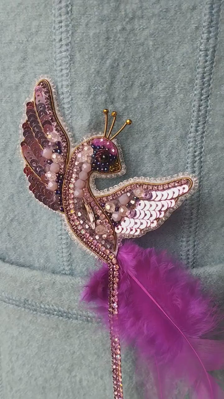 Experience the charm of this handmade brooch designed to add a whimsical yet elegant touch to your outfit. The decorative brooch showcases a vibrant purple bird motif accented with a long feather and shimmering bugle beads, making it an eye-catching piece that enhances any look.