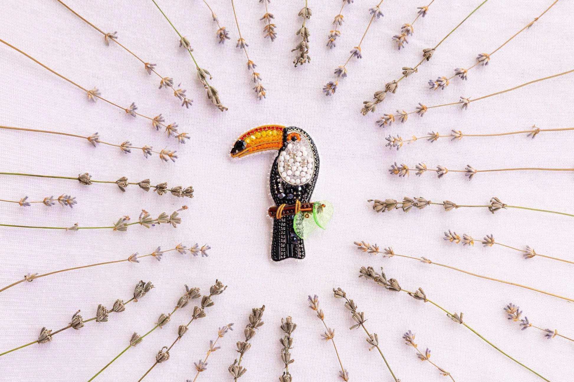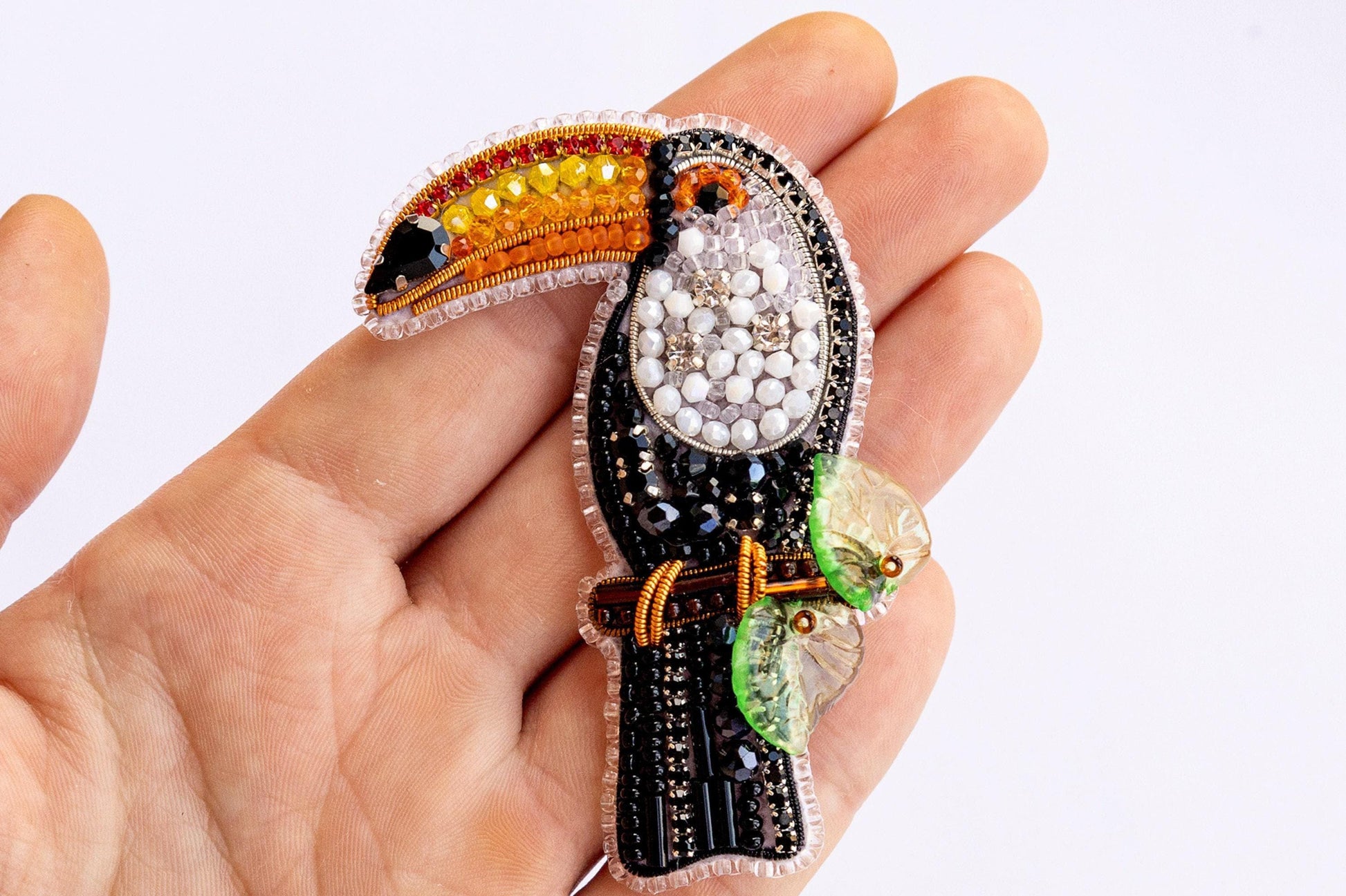 This beaded brooch features a stunning toucan bird design, expertly crafted as a handmade brooch that adds a whimsical and elegant touch to any outfit. Measuring 3.1 x 1.9 inches (8 × 5 cm), this embroidered pin showcases fine beadwork design using high-quality Czech seed beads, bugle beads, and art glass pins on felt embroidery brooch base. The metal pin clasp on the back ensures the decorative jacket pin stays securely in place on jackets, scarves, hats, or bags.