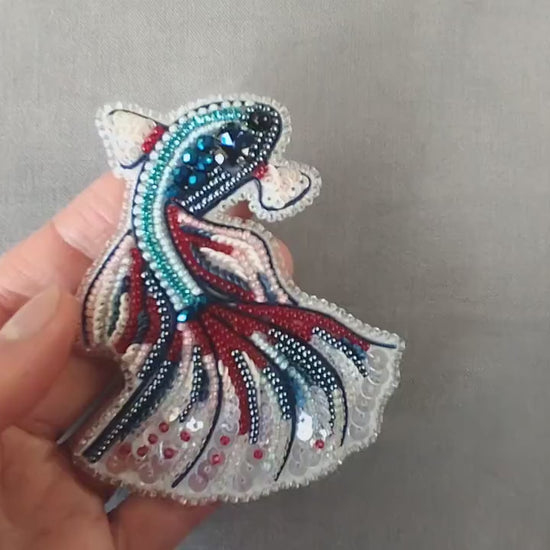 This beaded brooch, featuring a striking Veiltail Fish design, combines exquisite craftsmanship with whimsical elegance to enhance any outfit. Handmade with delicate bead embroidery on felt, this embroidered jewelry piece uses high-quality Czech seed beads and art glass beads to create a colorful beaded pin that measures 3 x 3.7 inches (8 x 9.5 cm). The metal pin brooch attached securely on the back ensures it stays in place on jackets, scarves, or bags, making it a fine beadwork accessory perfect for fashion lovers.