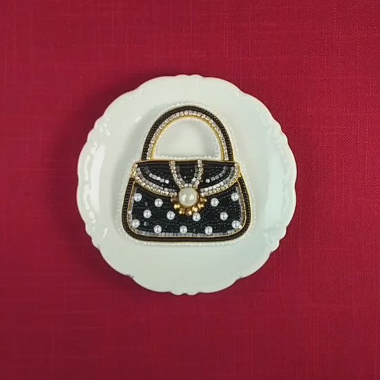 - Handbag shaped brooch design that adds a playful yet elegant accent to any outfit