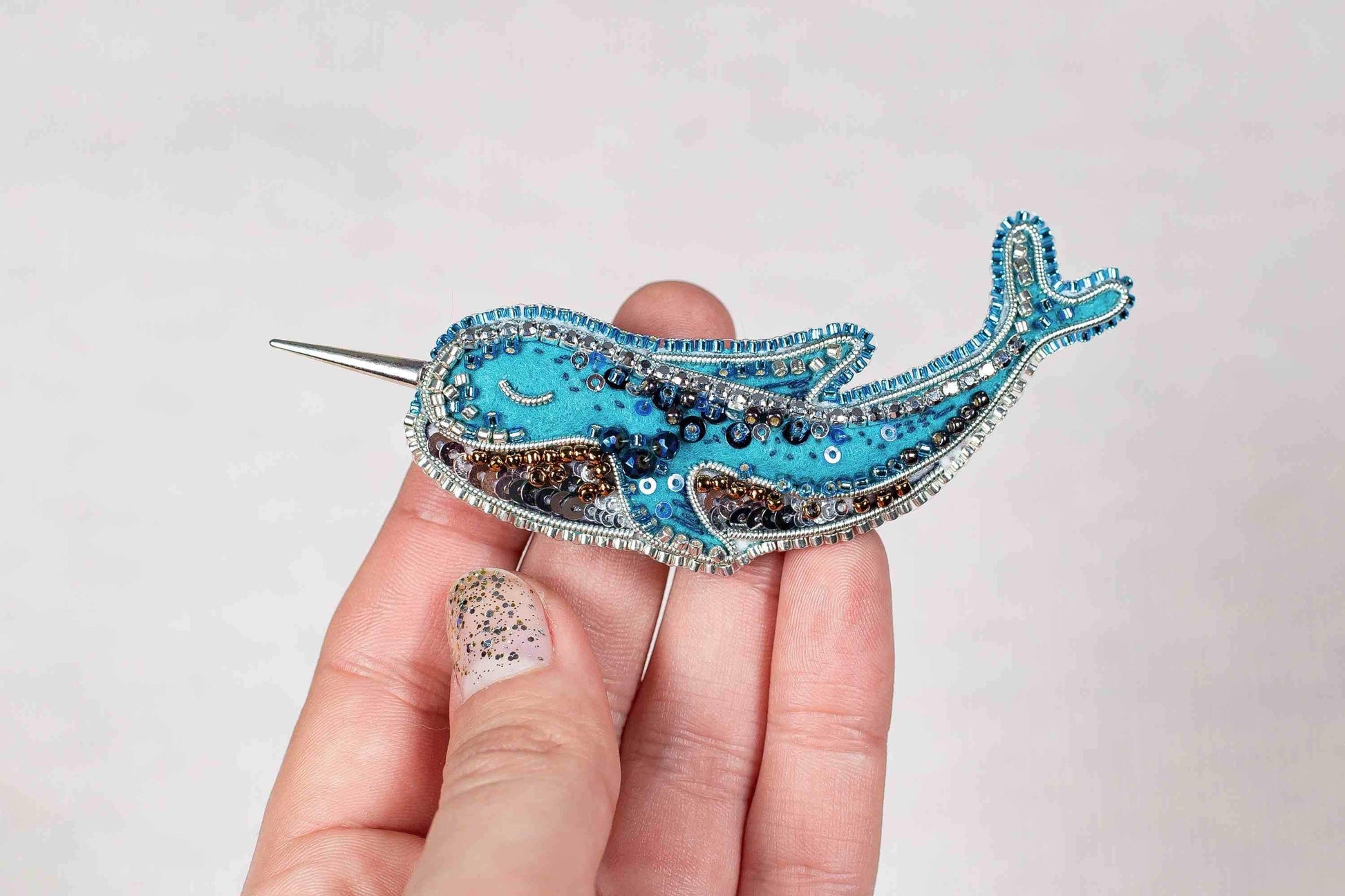 This beaded narwhal brooch is a handmade brooch that combines delicate beadwork art with whimsical fashion pin design to elevate any outfit. Crafted with precision, this felt embroidered brooch features high-quality Czech beads, bugle beads, and art glass jewelry elements that create a stunning beaded animal pin. Measuring 4 x 1 1/2 inches (10 x 4 cm), this handcrafted jewelry pin is lightweight yet durable, making it perfect for daily wear or special occasions. The secure metal pin on the back ensures the brooch stays firmly attached to jackets, scarves, hats, or bags.