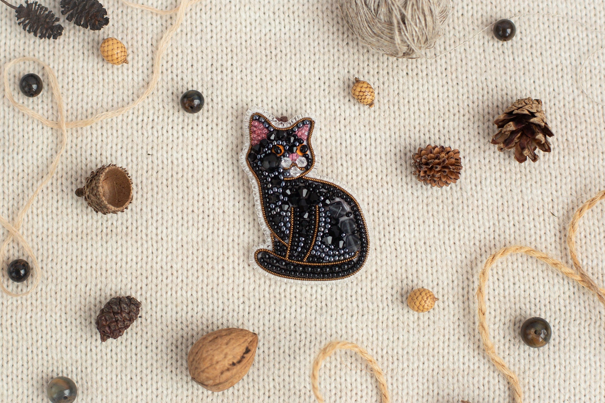 Try our DIY craft kit - bead embroidery kit set for making a unique bead brooch kit. Our DIY beading kit allows you to create a lovely holiday brooch or keychain shaped like a black cat. The cat brooch is beautifully designed with shades of black color. You can attach a pin base to the finished jewelry and wear it as a brooch on your clothes or clip it onto your backpack. Alternatively, you can sew a loop onto the decoration and use it as a keychain on your bag, wear it as a pendant, display it near your workspace, or decorate your home. With this kit, you can create a cozy atmosphere for your home or give it as a gift to your loved ones. A handmade gift is always a lovely way to show attention and love, and this Siamese cat brooch would make a great present for your mom's birthday, your sister at New Year's, or a cat-loving colleague. If you're not a fan of sewing, you could always give this kit to your daughter or grandmother, and they can enjoy making it during long, cozy evenings. The kit comes with everything you need to create the jewelry, including a unique pattern designed by our artist, high-quality materials, and a work description.