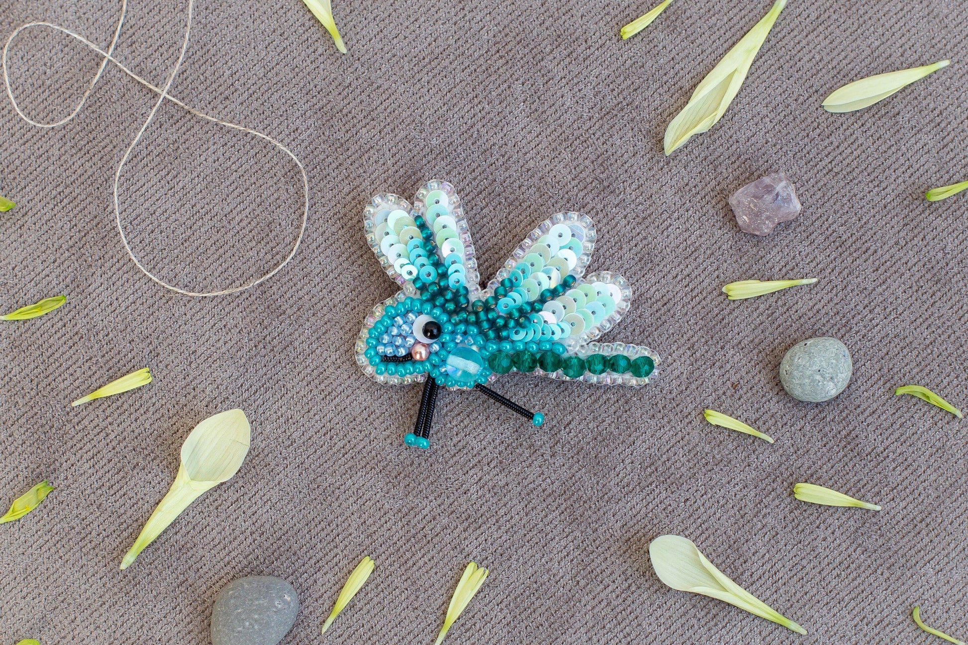 Try our DIY craft kit - bead embroidery kit set for making a unique bead brooch kit. This children's bead embroidery set comes in the shape of a cartoon flying dragonfly with sky-blue pearls and pearl stilettos on its wings. The set includes all the necessary materials, such as a specially designed pattern by our artist, Czech and Preciosa beads of high quality, visual diagrams, and clear instructions for creating the decoration.
