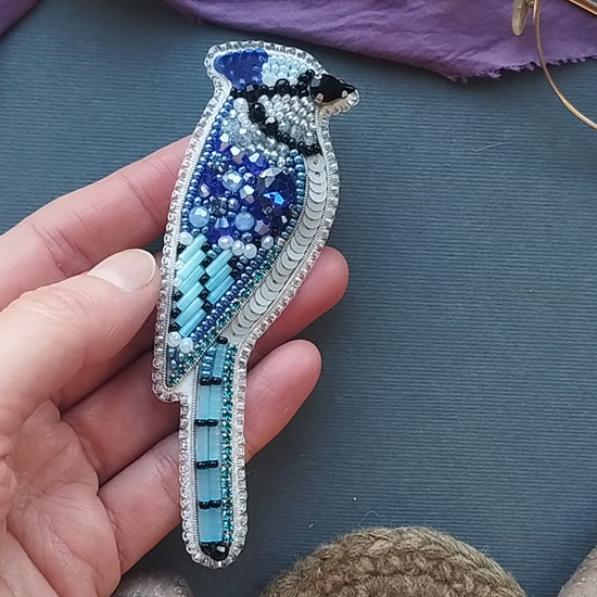 The blue jay beaded brooch is a handmade bird pin that adds a striking touch of elegance and whimsy to any outfit. This embroidered brooch measures 1.8 x 4.3 inches (4.5 x 11 cm) and features delicate beadwork art crafted with high-quality Czech seed beads, bugle beads, and art glass jewelry components. Designed as a handcrafted bird brooch, it showcases detailed bird embroidery pin work that captures the vibrant colors and charm of a blue jay. The secure metal pin on the back ensures this ornamental bird pin stays firmly attached to jackets, lapels, scarves, or bags.