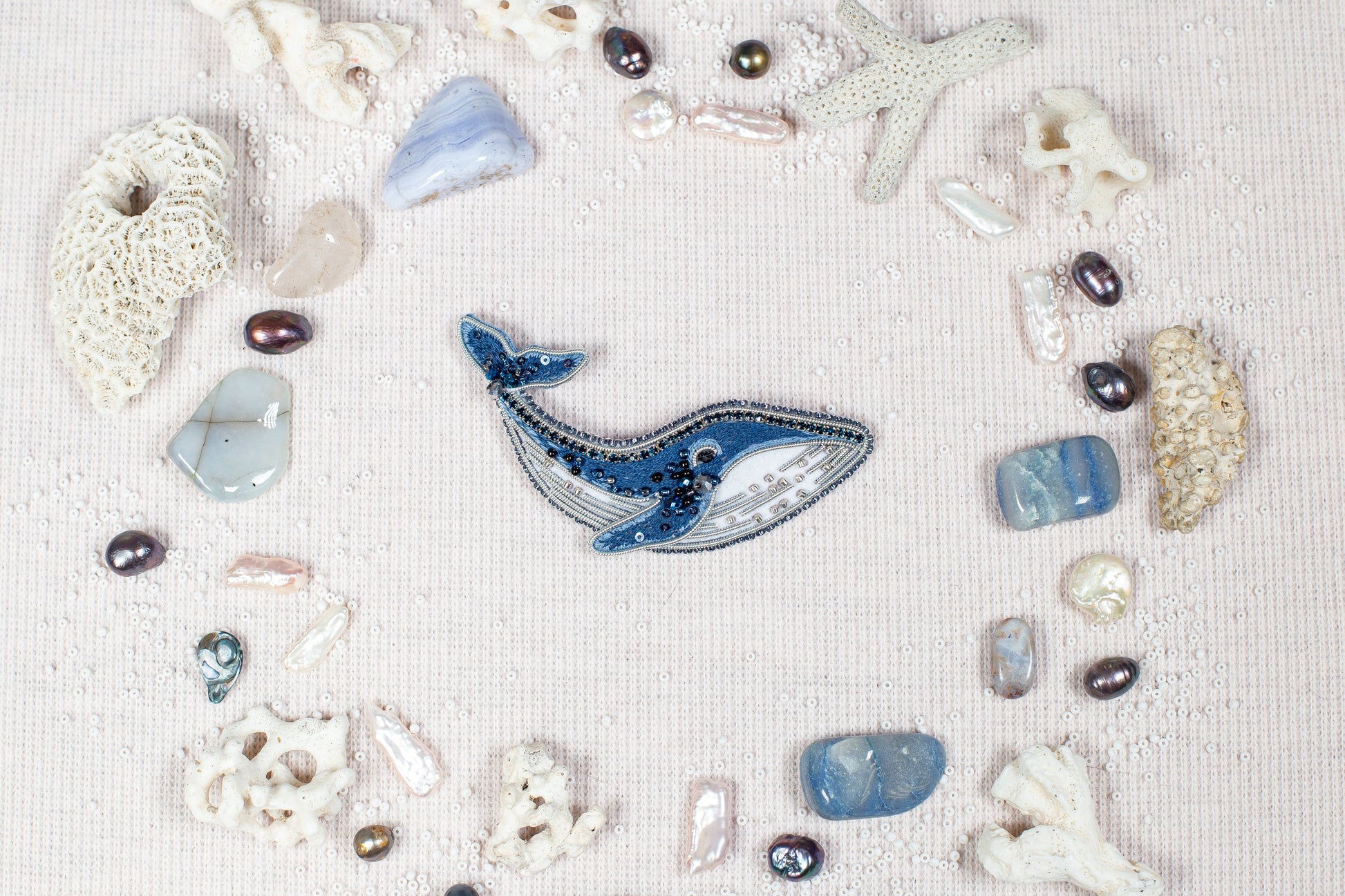 Try our DIY craft kit - bead embroidery kit set for making a unique bead brooch kit - noble blue whale with voluminous fins and various textures on the side. Different techniques are used to create this piece of jewelry, including beadwork and embroidery, cord and rhinestone chain decoration, satin stitch embroidery, and wirework.