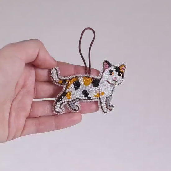 The Calico Cat Brooch is a handmade beaded brooch designed to add a whimsical touch to any outfit while showcasing delicate beadwork design. This embroidery art pin measures 2 x 2.4 inches (5 x 6 cm) and features high-quality Czech seed beads, bugle beads, and art glass beads meticulously stitched onto felt. The handcrafted cat pin fastens securely with a sturdy metal pin on the back, making it an ideal jacket accessory pin that stays in place throughout the day. Each unique cat accessory is created with precision, ensuring that the embroidered animal brooch stands out as a charming and elegant addition to your jewelry collection.