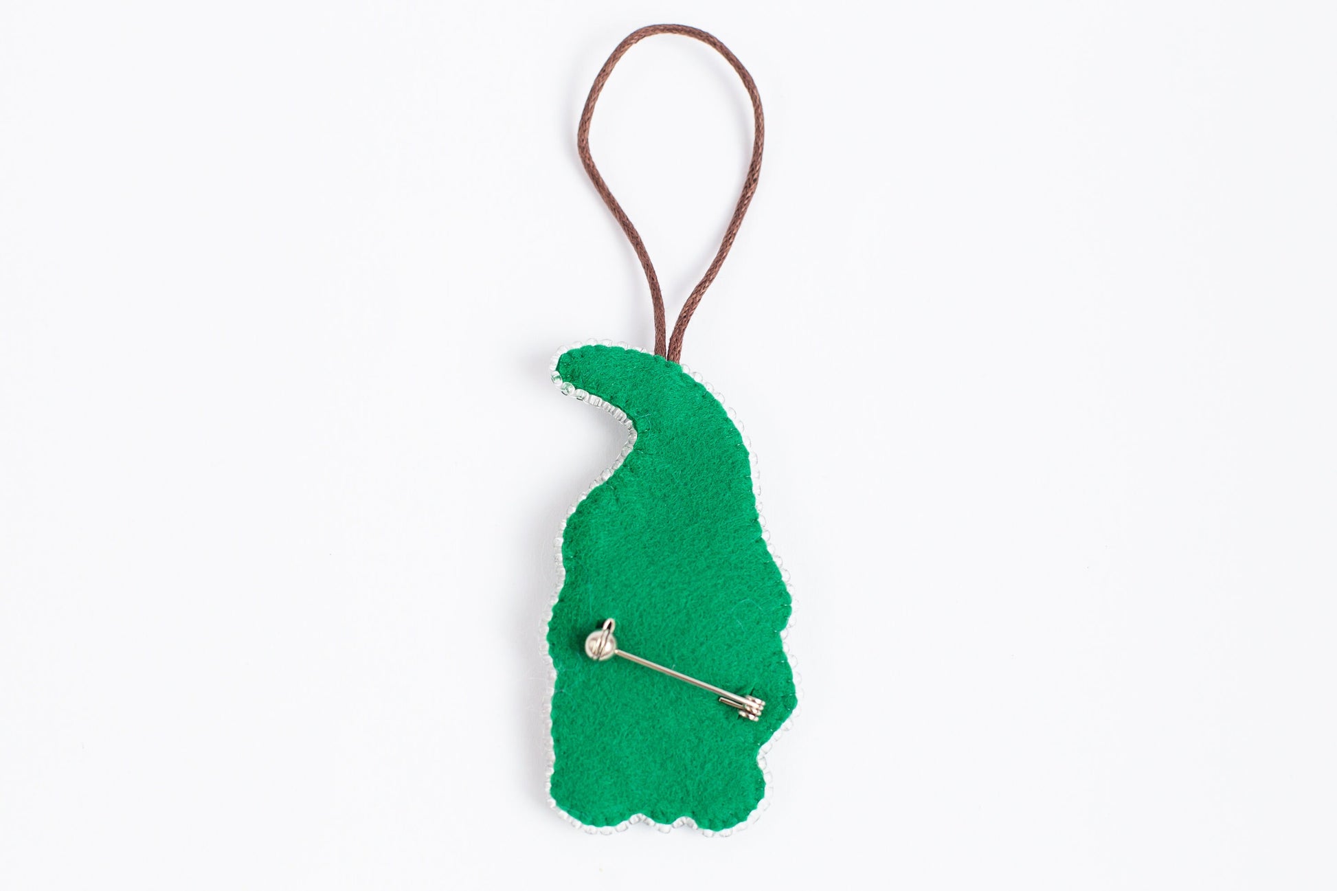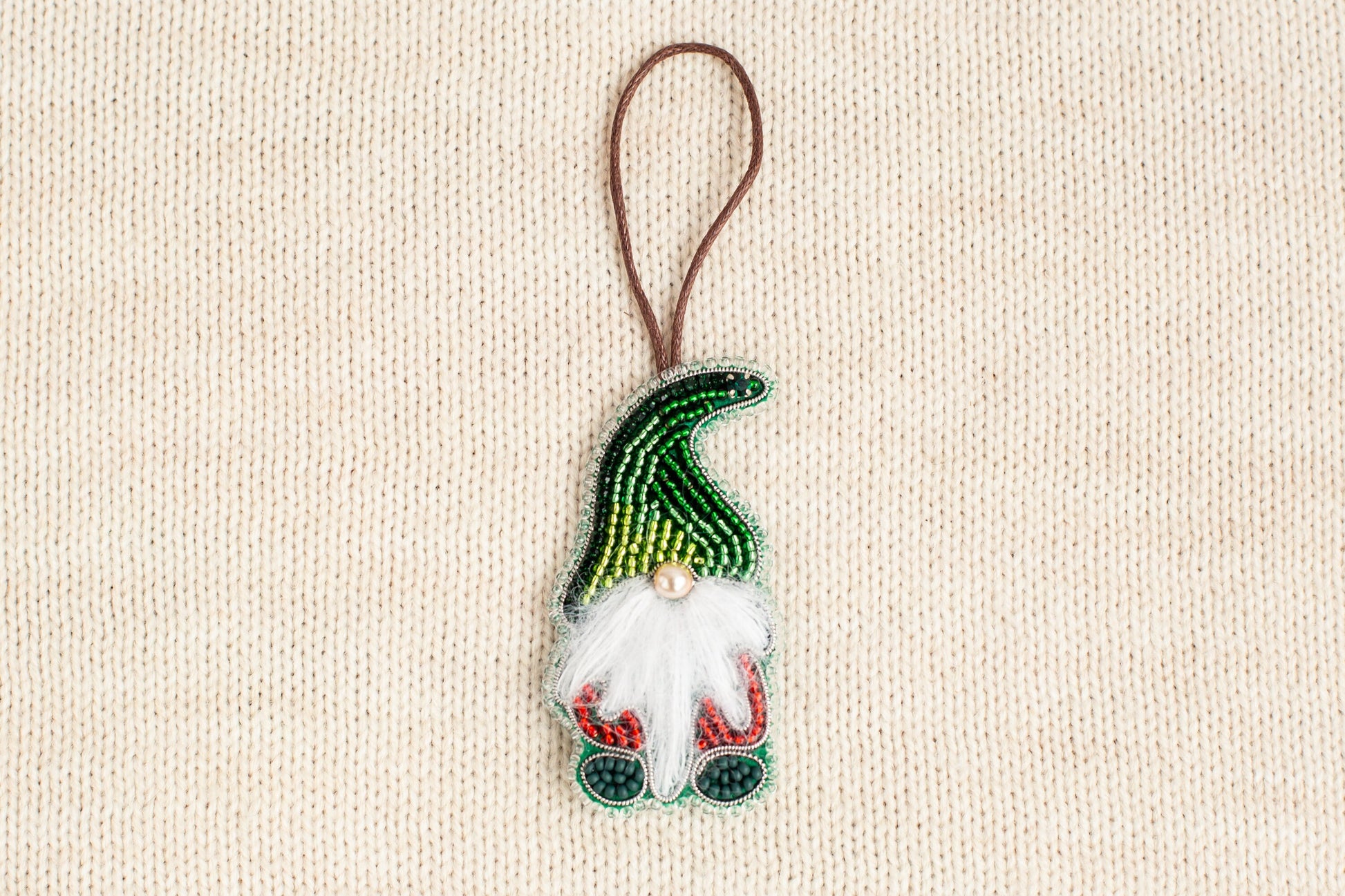 Try our DIY craft kit - bead embroidery kit set for making a unique bead brooch kit. This DIY kit is for creating a green and red beaded brooch in the shape of a Scandinavian gnome, which is a beloved symbol of Christmas. Every aspect of this charming embroidered brooch is delightful, from the stocking hat to the long white beard and the big nose made of pearl beads. This figural brooch is perfect if you need an eye-catching Christmas accessory, winter holiday jewelry, or a stocking filler. It would make an excellent gift for anyone who appreciates handmade brooches or embroidered jewelry. Additionally, you can use this brooch as a keychain, a pendant for a bag, or a Christmas ornament.