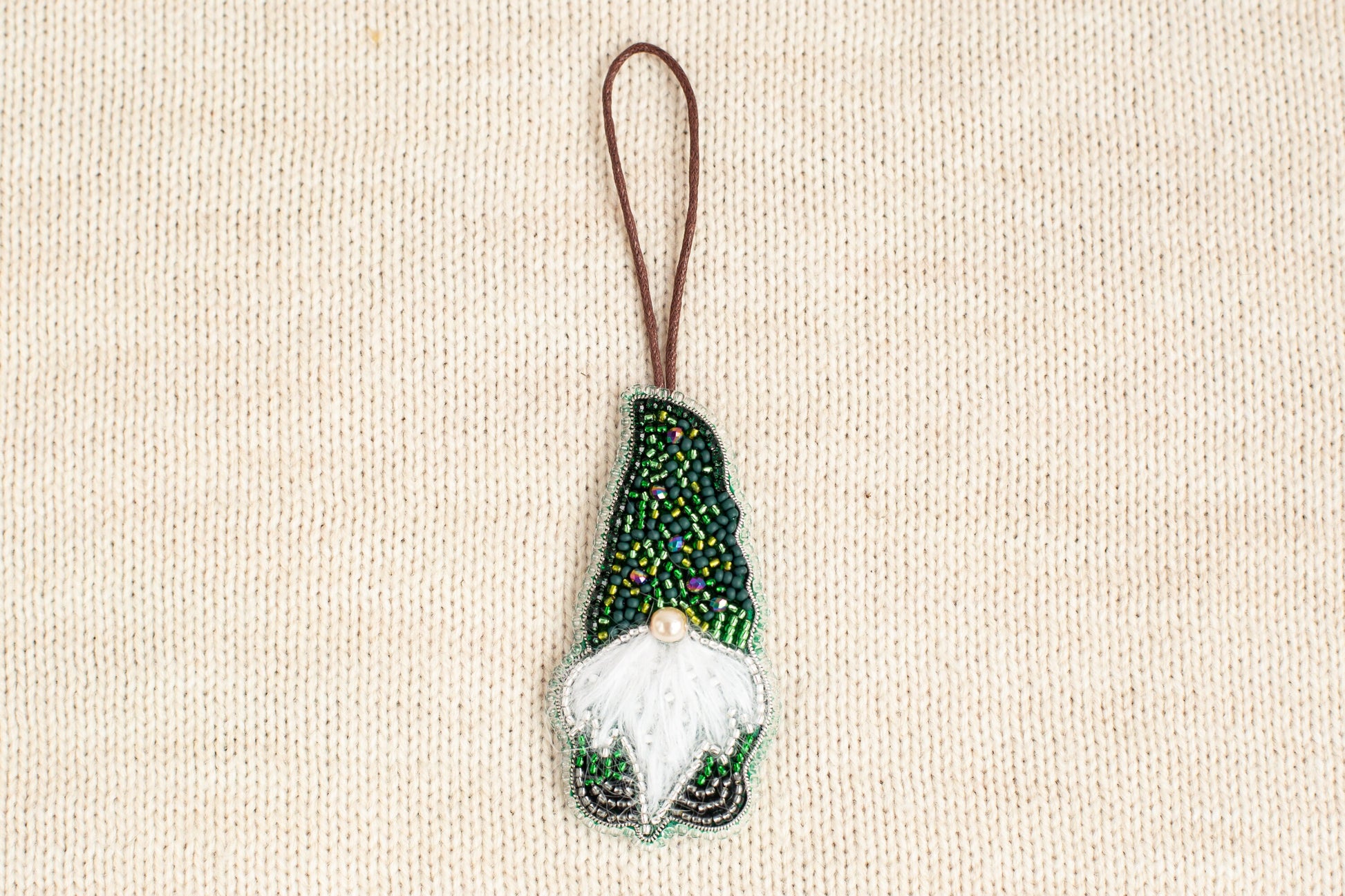 Try our DIY craft kit - bead embroidery kit set for making a unique bead brooch kit. This kit contains everything you need to create a charming embroidered brooch that can also be used as a keychain or pendant. The brooch is to be shaped like a Scandinavian gnome with a long white beard, a big round nose, and a high stocking hat. The seed bead embroidery adds a sparkling touch to this cute Christmas accessory, making it the perfect addition to your holiday outfit. You can even use it as a Xmas ornament or stocking filler. It's an excellent gift for those who appreciate handmade brooches and embroidered jewelry and love gnomes.