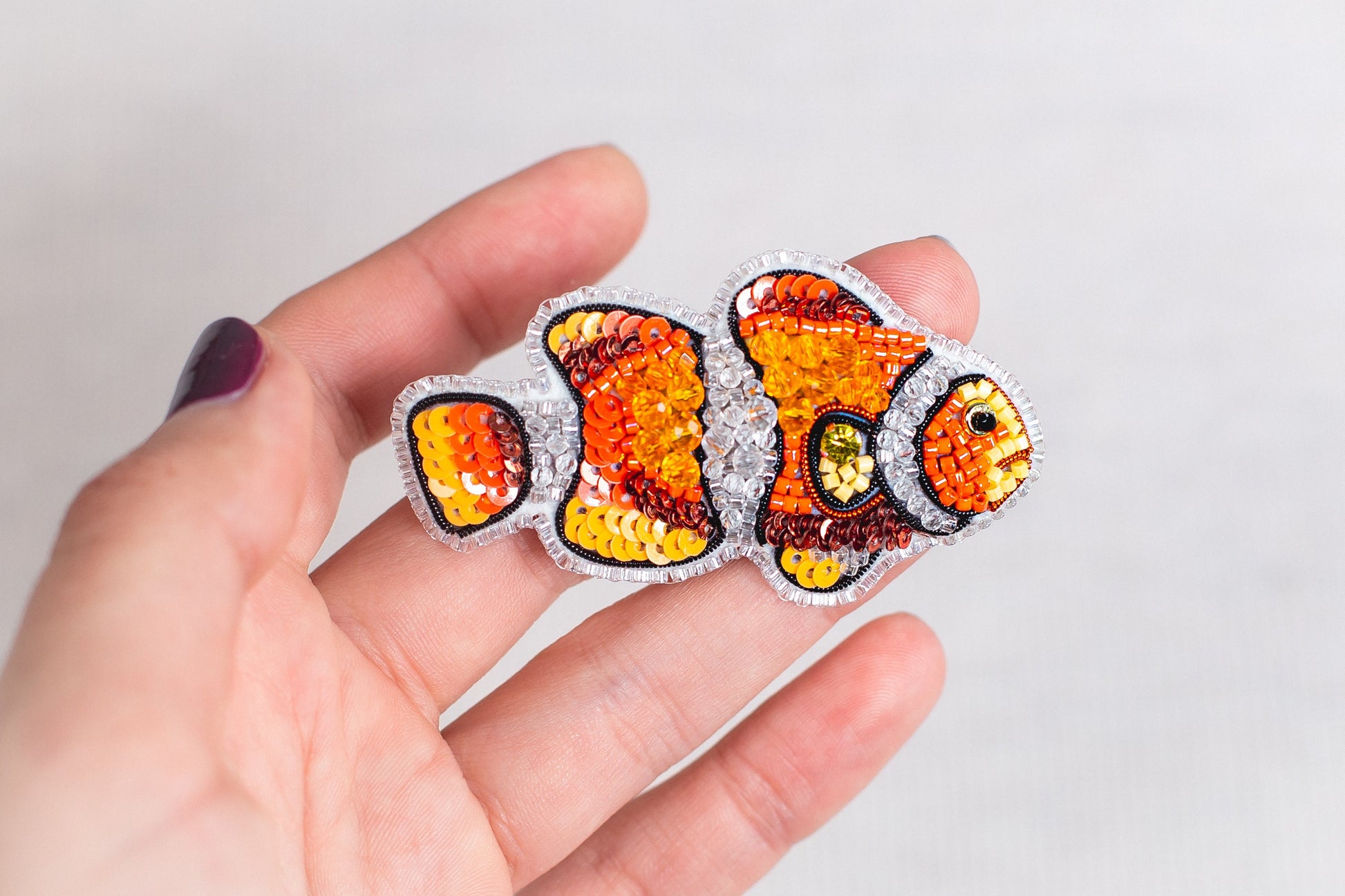 Try our DIY craft kit - bead embroidery kit set for making a unique bead brooch kit. Even if you are a beginner in bead embroidery artwork – our diy beading kit will help you to create a stunning clown fish brooch or pendant to highlight your unique style! Our embroidery kit includes all the materials to make an intricate and beautiful beaded piece of jewelry. With Japanese and Czech beads, tinsel cord, multi-colored sequins, sparkling rhinestones, and other high-quality materials, you can be sure that your finished beaded clown fish will shine like real gold.