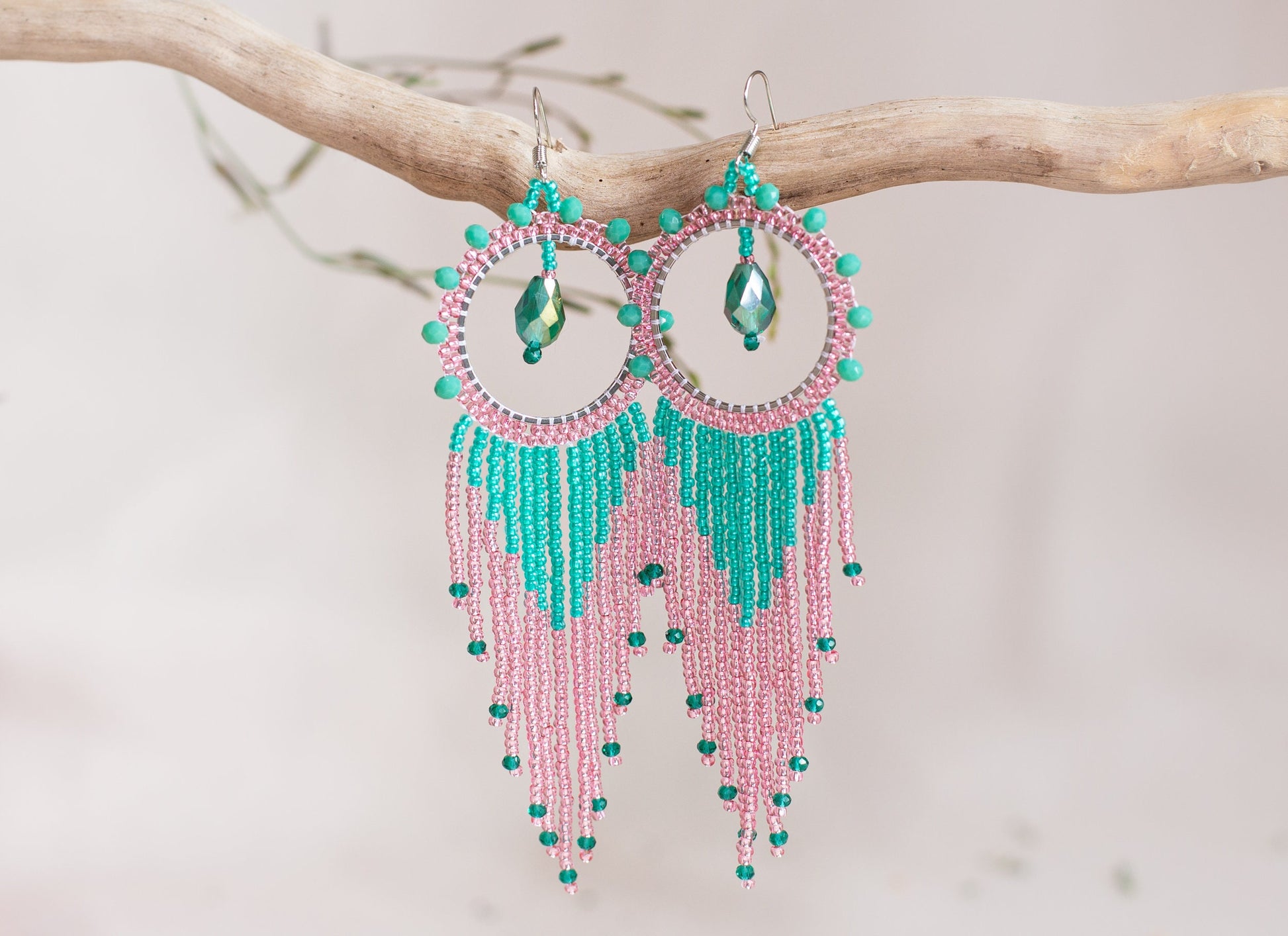 Explore your creativity with our DIY Beading Kit and design your own pair of dazzling hoop earrings. This kit provides all the materials you need to create large, statement earrings with an elegant long fringe and a central bead in bold and fresh shades of pink and emerald. These earrings are perfect for adding a unique accent to your profile, making them a standout accessory that offers endless enjoyment as you craft your unique jewelry piece.