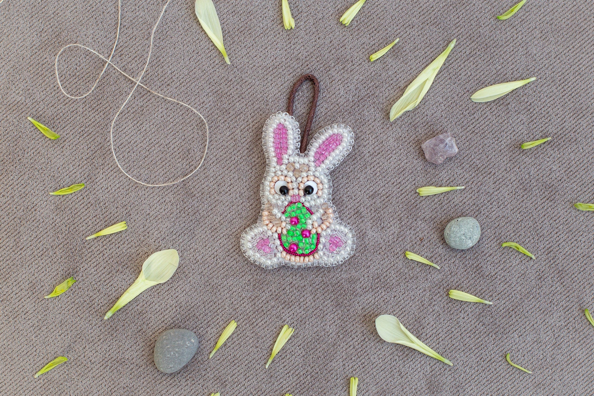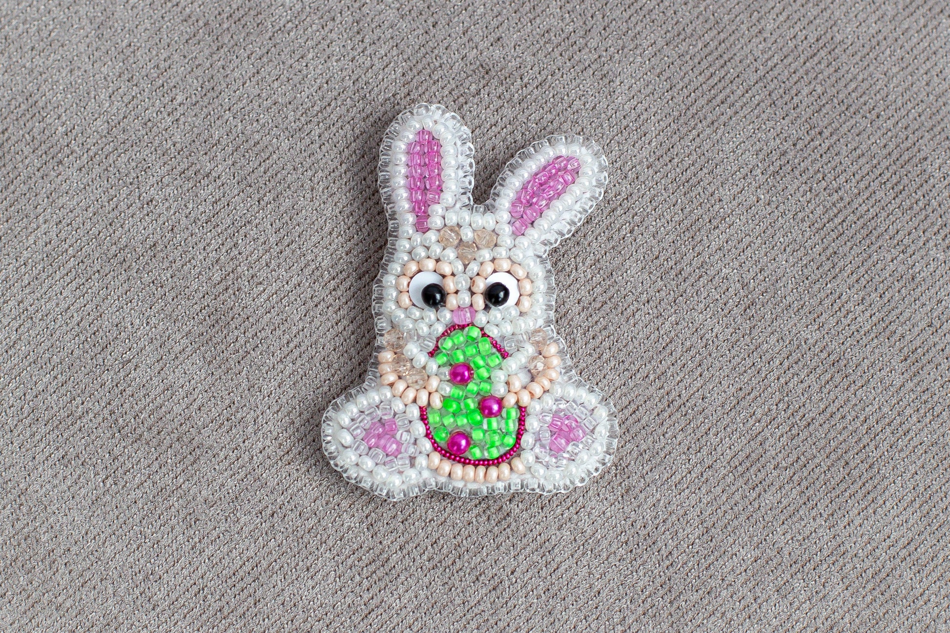 Try our DIY craft kit - bead embroidery kit set for making a unique bead brooch kit. We offer you our beading kit for making an embroidered brooch in the form of a funny bunny with a colorful Easter egg. Our beading kit includes everything you need to make a beaded pin with pleasure and without much effort.