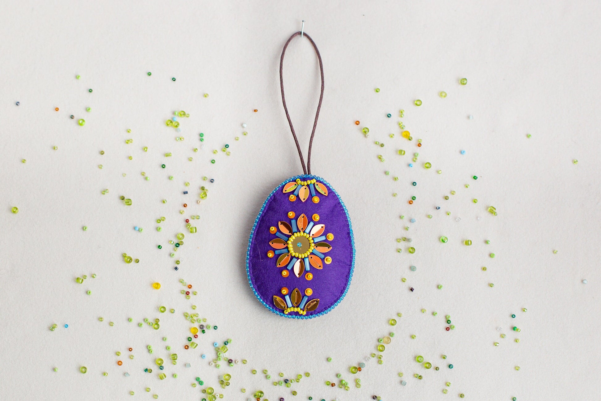 Every kit contains everything you need to create the ornament: a unique pattern designed by our artist, Czech beads and Preciosa seed beads, other high-quality materials, a visual pattern, and a clear work description. You can equip an embroidered egg with a loop, hang it on an Easter tree, decorate the interior, and wear it as a keychain on a backpack. Or you can insert a stick into the egg and use it as a topper for flower pots and holiday Easter bouquets.