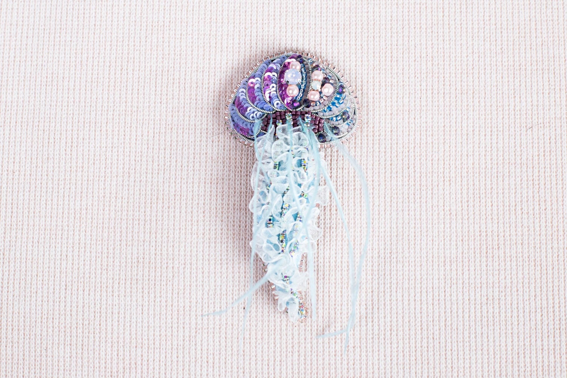 This handmade beaded brooch is a stunning jewelry accessory designed to add a whimsical and elegant outfit accent. Featuring intricate Czech bead embroidery, this felt embroidered brooch measures 2 by 4 inches (5 by 10 cm), making it the perfect size to complement any jacket or top. The artisan glass brooch showcases delicate seed beads and handcrafted beadwork that form a beautiful beaded jellyfish pin, blending vibrant colors and textures for a unique brooch gift that stands out.