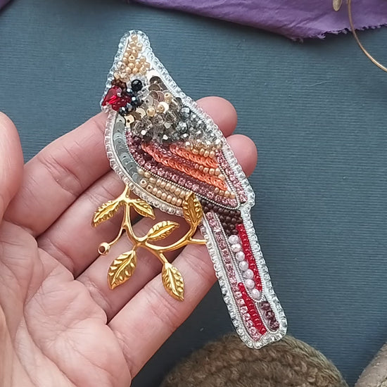 - Design: Cardinal bird brooch with intricate seed bead jewelry and ornamental beadwork