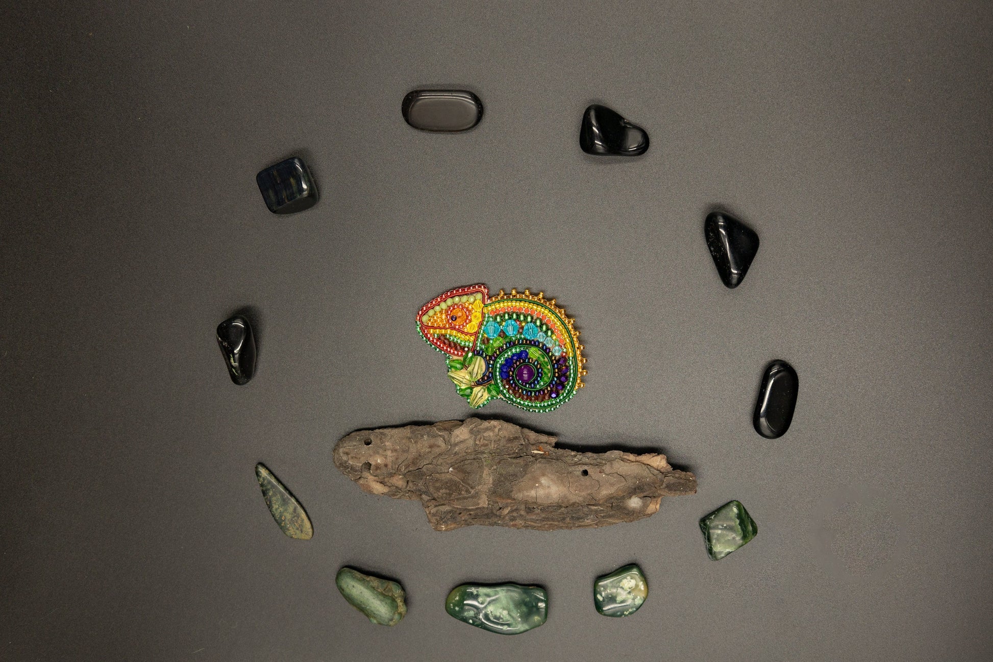 This handmade beaded brooch features a stunning chameleon design, expertly crafted to add a whimsical touch to your wardrobe. The handmade beaded brooch is embroidered on felt using high-quality Czech seed beads, bugle beads, and various sizes of art glass beads, ensuring a delicate beadwork design that stands out. Measuring 2 x 2.7 inches (5 x 7 cm), this lizard embroidery pin is lightweight yet durable, making it the perfect jacket lapel accessory or embellishment for bags and scarves.