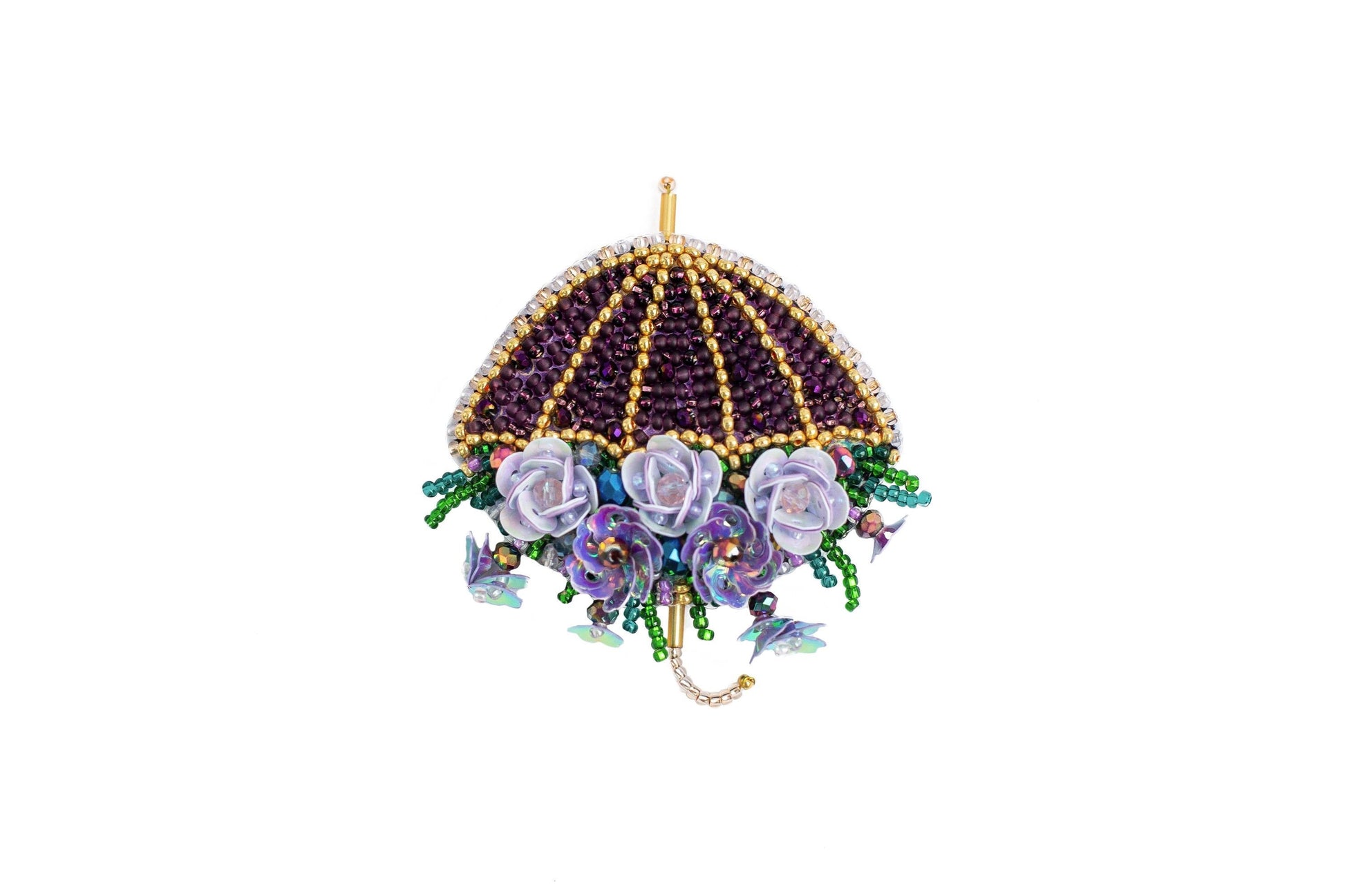 This handmade beaded brooch is a flowered umbrella brooch that combines delicate beadwork design with whimsical charm to enhance any elegant outfit accessory. Measuring 3 x 3 inches (6.8 x 6.6 cm), this embroidered brooch features high-quality Czech seed beads, bugle beads, and art glass pin elements carefully handcrafted to create a unique jewelry gift that stands out. The metal pin brooch attached securely on the back ensures it stays in place on jackets, lapels, or bags, making it a versatile decorative lapel pin and jacket brooch accessory.