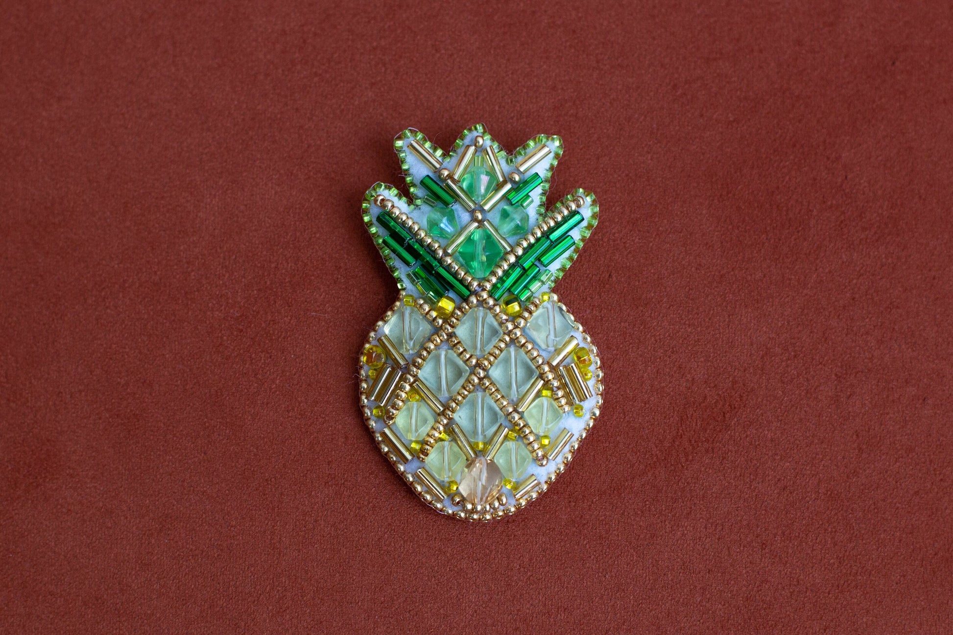 This handmade beaded brooch is a stunning pineapple brooch designed to add a whimsical and elegant touch to any outfit. Each handcrafted embroidery pin features delicate beadwork art created with high-quality Czech beads and seed beads, carefully embroidered on soft felt. Measuring 2.7 x 1.7 inches (6.8 × 4.2 cm), this felt embroidered pin is lightweight yet durable, making it an ideal decorative jacket pin for daily wear or special occasions. The metal pin securely fastens the brooch to your clothing, ensuring it stays in place without damage.