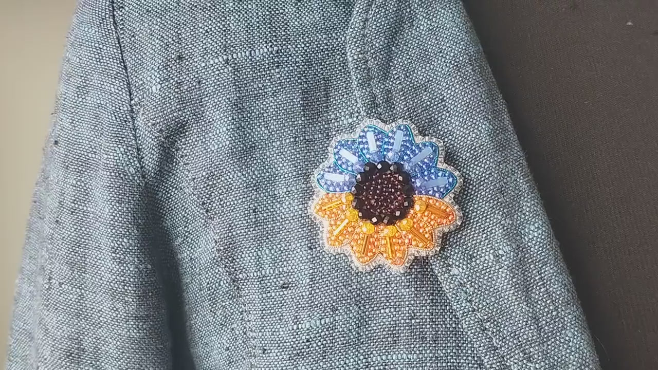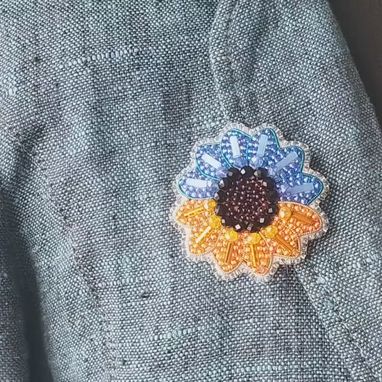 This handmade beaded brooch is a stunning sunflower brooch designed to add a whimsical outfit accessory that combines elegance with artisanal craftsmanship. Measuring 2 x 2 inches (5 x 5 cm), this flower pin is embroidered on felt using high-quality Czech beadwork, featuring delicate bead embroidery that highlights its vibrant floral brooch design. The artisan beaded pin includes a secure metal pin on the back, ensuring it stays firmly attached to any garment for lasting wear. Crafted with precision, this handcrafted jewelry accessory offers both unique style and durability, making it an ideal gift for her who appreciates fine, one-of-a-kind fashion pieces.