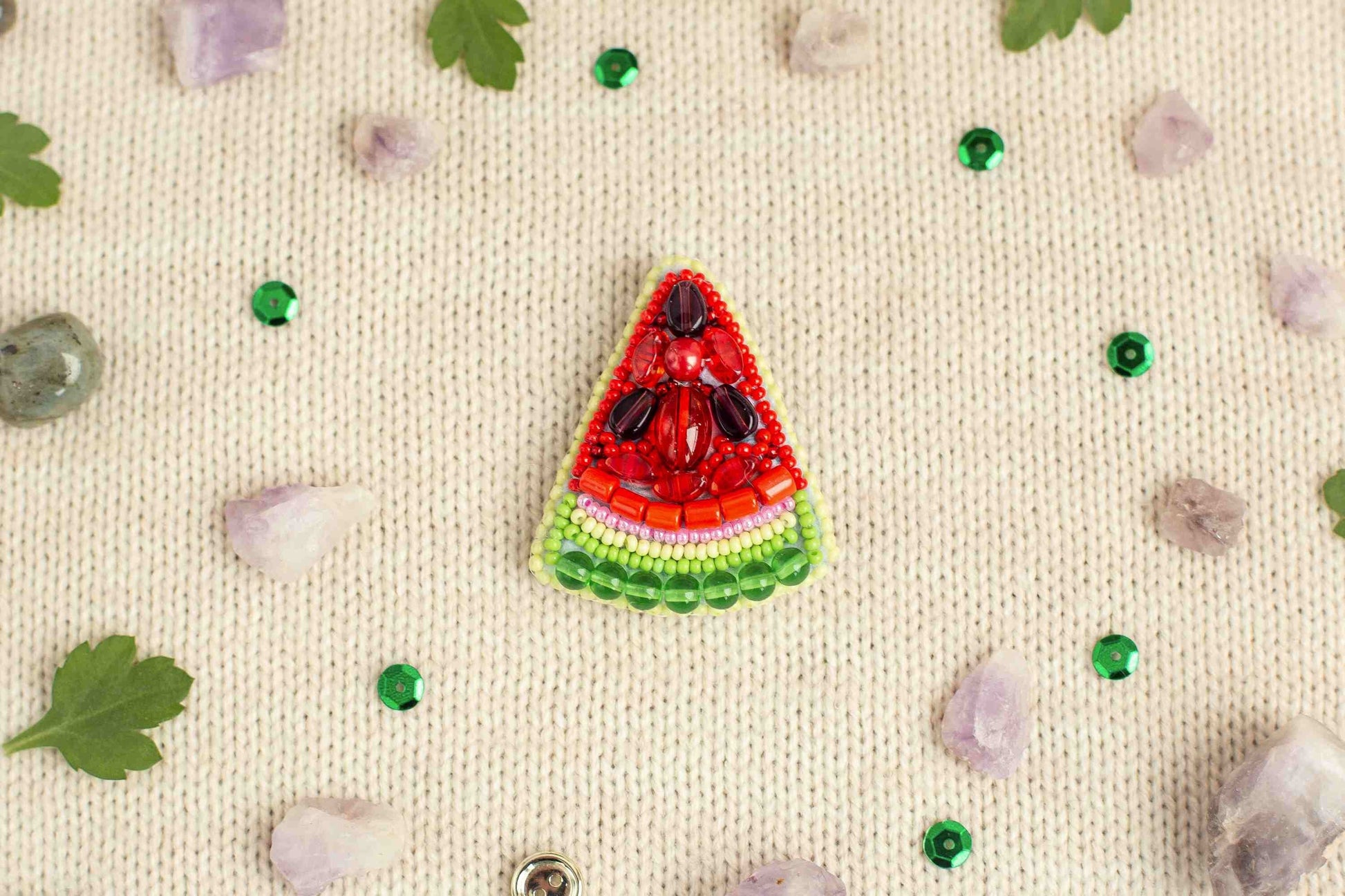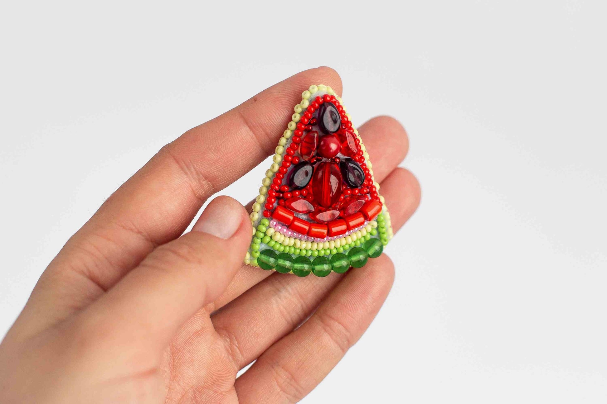 This handmade beaded brooch is a stunning watermelon brooch that combines fruit embroidery pin artistry with fine beadwork art to create a unique gift accessory. Measuring 2 x 2 inches (5 x 5.5 cm), this colorful beaded pin is embroidered on felt using high-quality Czech seed bead jewelry, bugle beads, and other small and large beads. The handcrafted jewelry gift features a metal pin backing that ensures the embroidered brooch pin stays securely fastened on any jacket lapel accessory or clothing item, adding whimsical fashion brooch charm to your outfit.