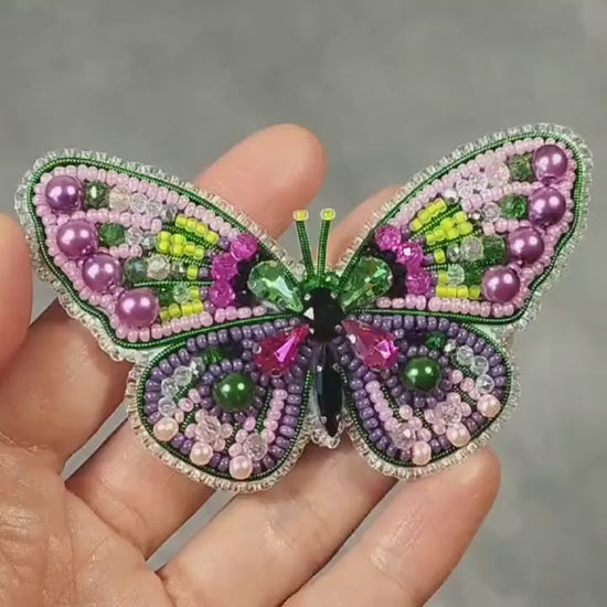 This handmade butterfly brooch is a stunning beaded brooch that brings a whimsical butterfly jewelry accessory to your wardrobe, crafted to add elegance and charm to any outfit. Measuring 3 1/2 x 2.2 inches (9 x 5.5 cm), this embroidered insect pin features intricate Czech bead embroidery and delicate beadwork brooch techniques on soft felt, creating a unique beaded pin that captures the beauty of nature inspired jewelry. The metal pin attached securely holds the brooch in place on jackets, scarves, hats, or bags, making it a versatile decorative insect pin for daily wear or special occasions.