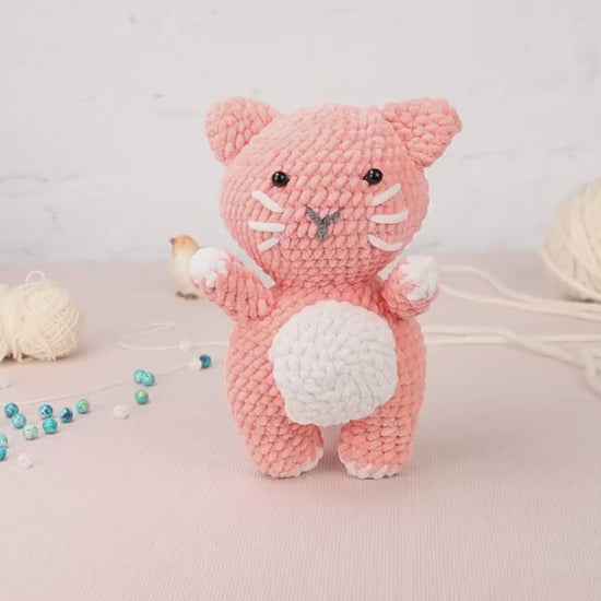 The Pink Plush Cat Crochet Kit is the perfect crochet cat kit for beginners who want to create a charming handmade cat doll. This beginner crochet set guides you through making a soft, cuddly amigurumi craft kit featuring a cute plush cat pattern with a round belly, white whiskers, and tail end. With this DIY crochet toy, you can make crochet kitten creations that bring joy and relaxation while developing your crochet hobby kit skills.