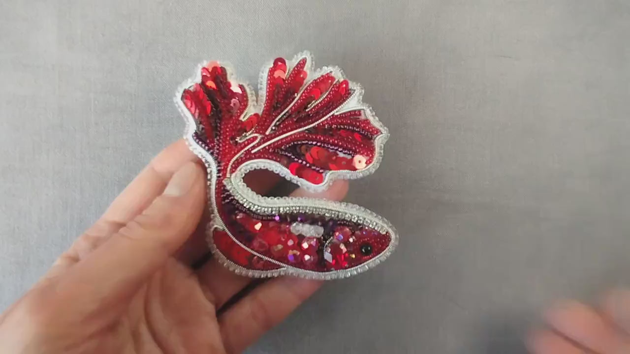 ✔ bead embroidery, beaded jewelry, red fish brooch, diy pin kit, bold design craft, elegant fins, gift for maker, detailed beading, flowing fish pin, handmade look, statement jewelry, creative diy, embroidery project