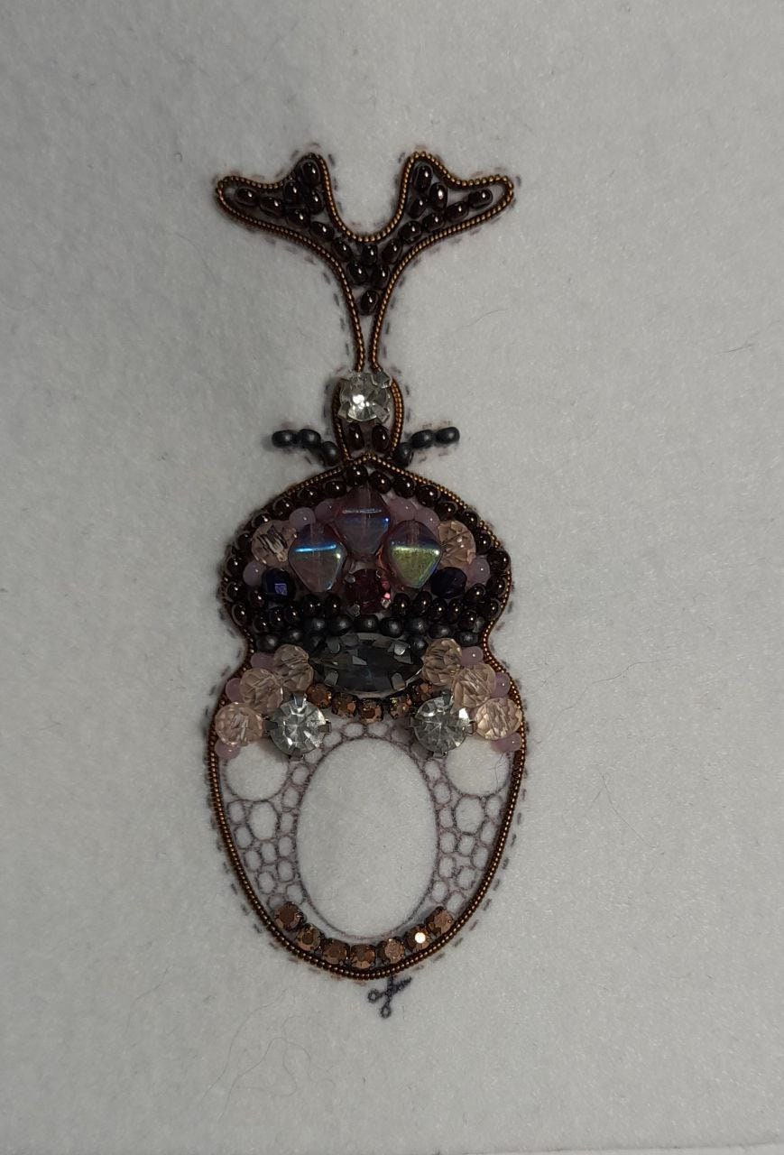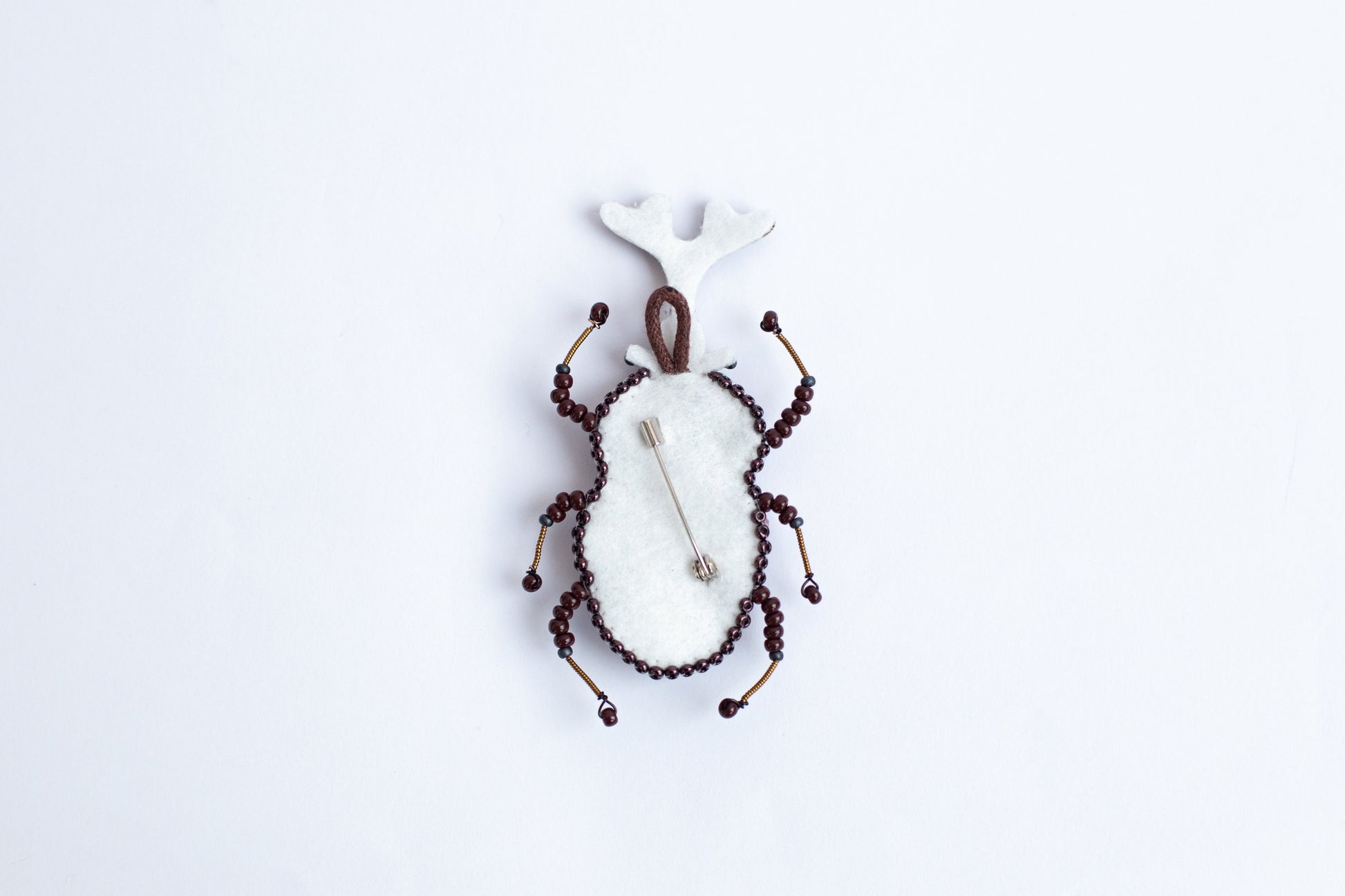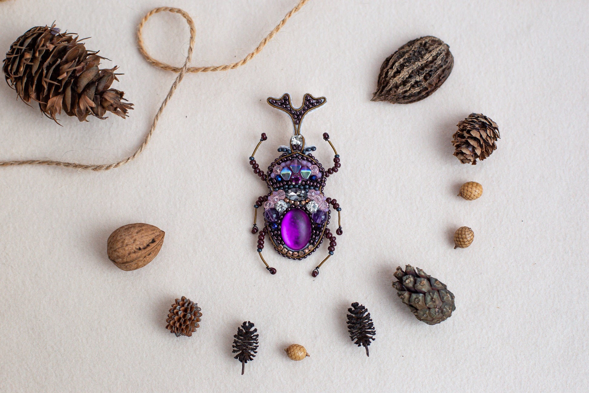 Try our DIY craft kit - bead embroidery kit set for making a unique bead brooch kit. This DIY embroidery bead set allows you to create a beautiful brooch, pin, or pendant shaped like a violet-black rhinoceros beetle with luxurious horns and movable legs. The kit includes everything you need to make this jewelry piece, including a unique pattern specially designed by our artist, Czech and Preciosa beads, high-quality materials, visual diagrams, and a clear description of the needlework.