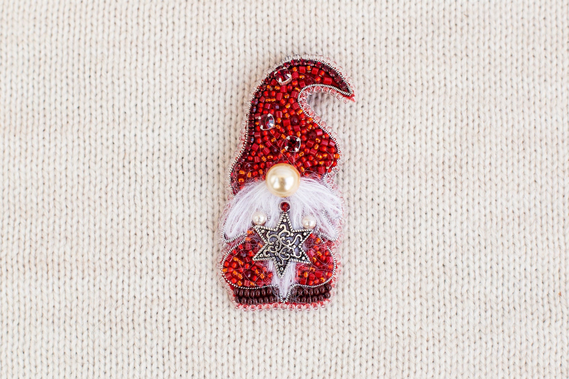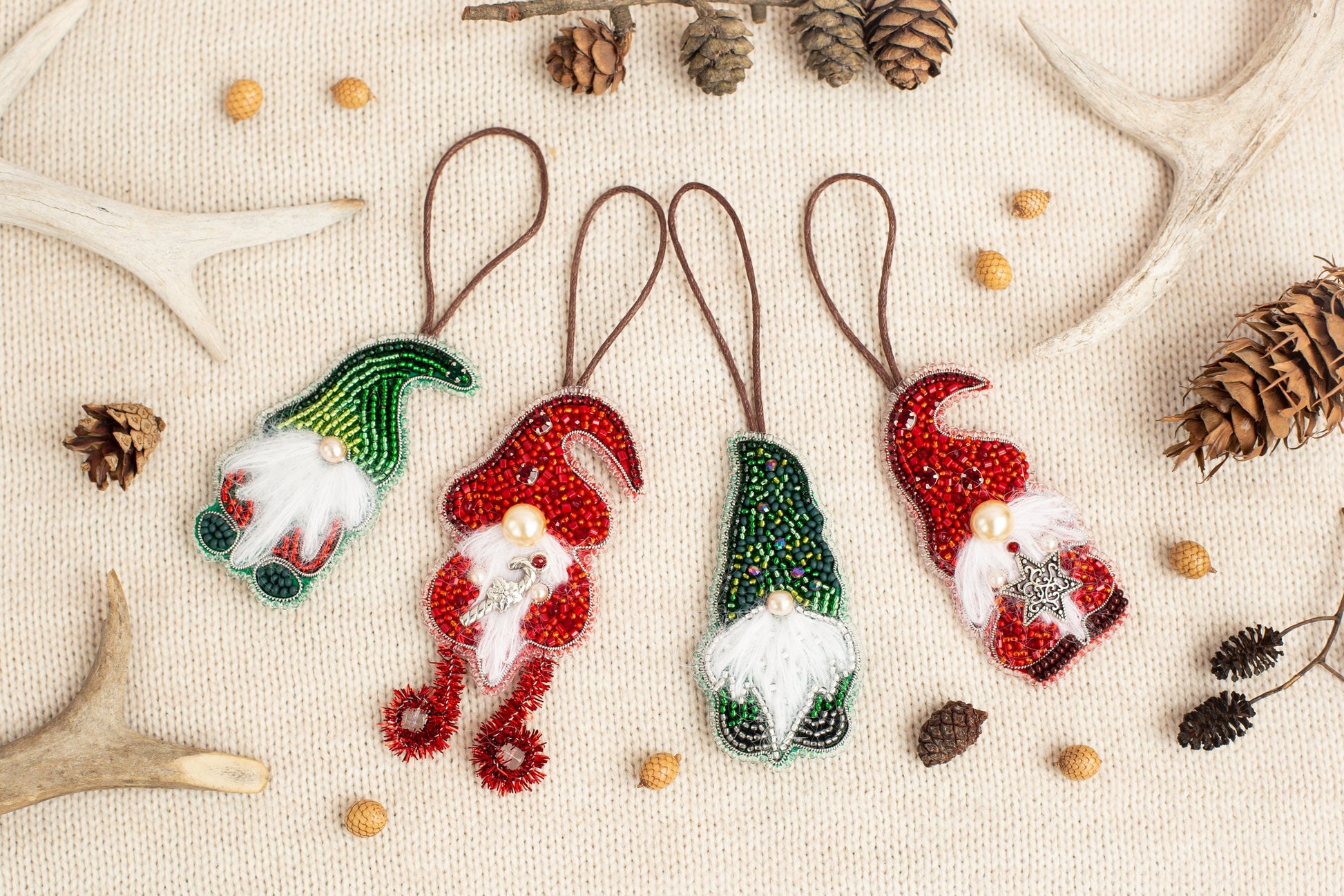 Try our DIY craft kit - bead embroidery kit set for making a unique bead brooch kit. This DIY kit contains everything you need to create your own festive accessories, including brooches, keychains, and pendants. The kit features adorable embroidered keychains in the form of Scandinavian gnomes that are sure to give your loved ones a holiday mood. Each beaded keychain has a unique festive design, but they all feature a stocking hat, a long white beard, and a big round nose. These cute gnome figurines can also be used as Christmas tree decorations, adding warmth and coziness to your holiday decor. These beaded ornaments are handmade with love and will stand out from other Christmas decorations. This kit is perfect for anyone who loves gnomes and enjoys crafting.
