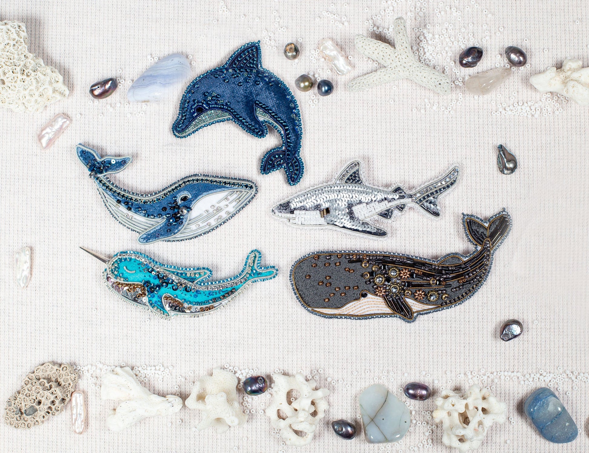 Set of 5 - Whale, Dolphin, Cachalot, Narwhale, Shark - Bead embroidery kits. Seed Bead Brooch kits. DIY Craft kits. Beadweaving Kits