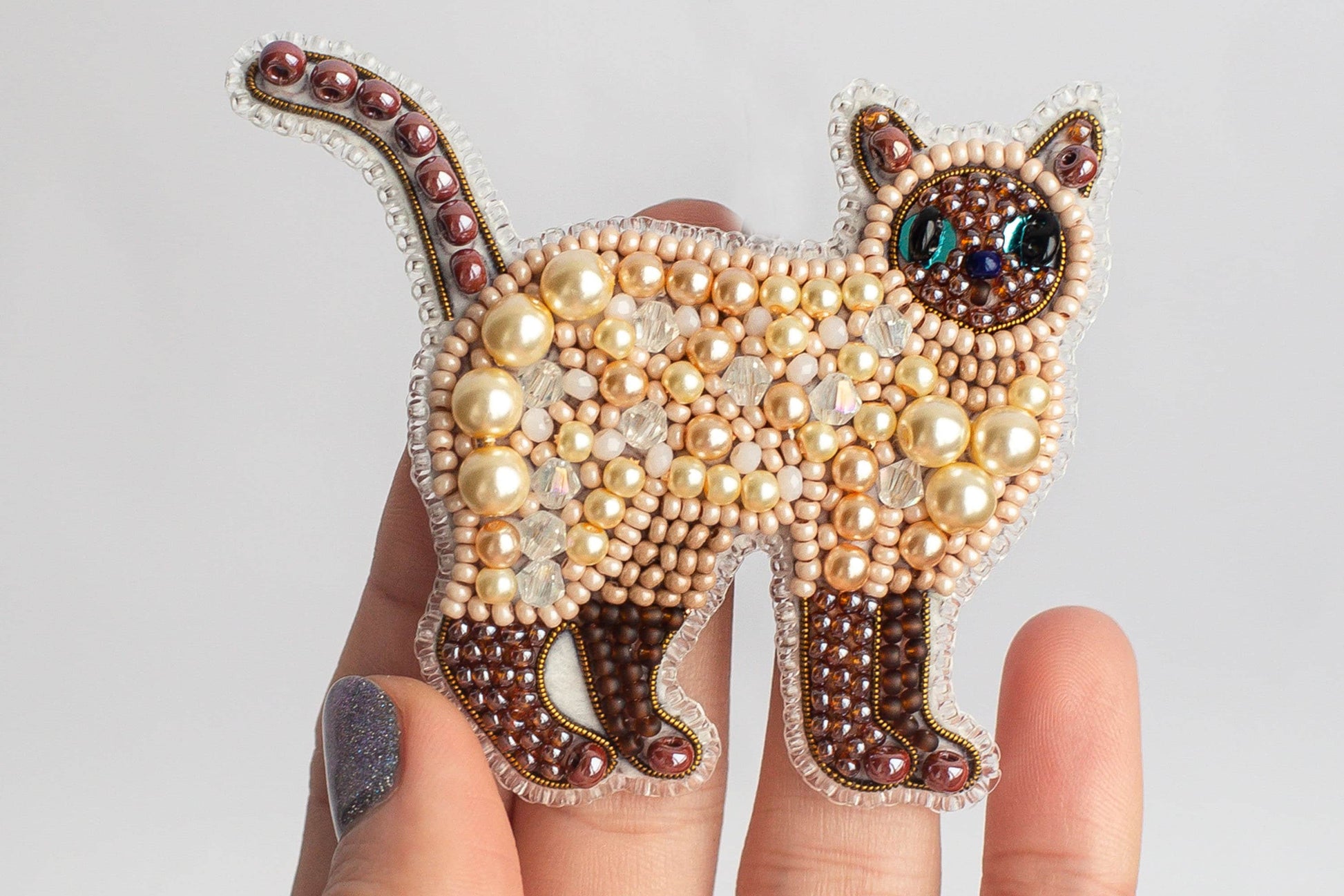 Try our DIY craft kit - bead embroidery kit set for making a unique bead brooch kit. Our DIY beading kit allows you to create a lovely holiday brooch or keychain shaped like a purebred Siamese cat. The cat is beautifully designed with beige and brown colors. You can attach a pin base to the finished jewelry and wear it as a brooch on your clothes or clip it onto your backpack. Alternatively, you can sew a loop onto the decoration and use it as a keychain on your bag, wear it as a pendant, display it near your workspace, or decorate your home. With this kit, you can create a cozy atmosphere for your home or give it as a gift to your loved ones. A handmade gift is always a lovely way to show attention and love, and this Siamese cat brooch would make a great present for your mom's birthday, your sister at New Year's, or a cat-loving colleague. If you're not a fan of sewing, you could always give this kit to your daughter or grandmother, and they can enjoy making it during long, cozy evenings. The kit comes with everything you need to create the jewelry, including a unique pattern designed by our artist, high-quality materials, and a work description.