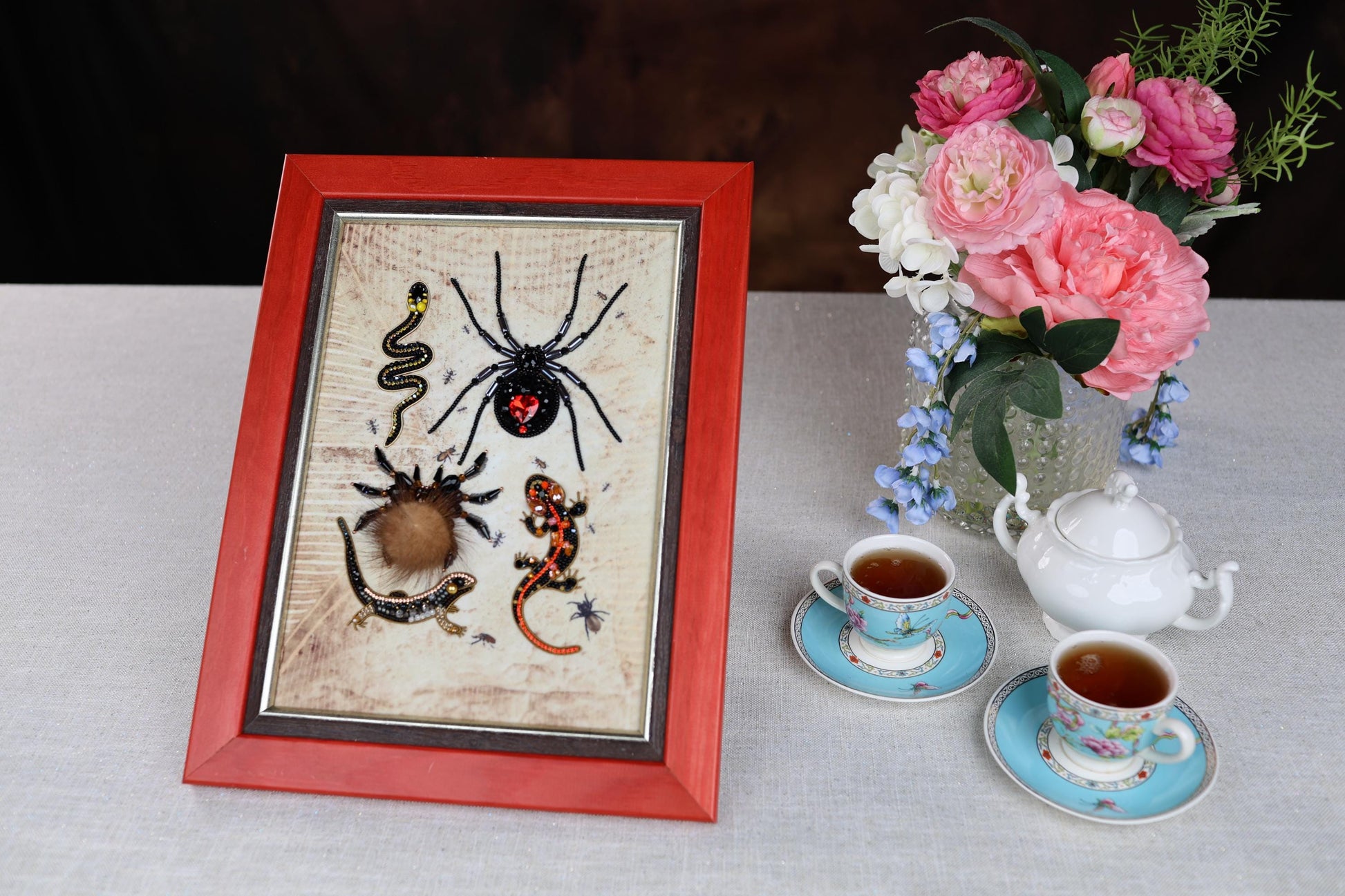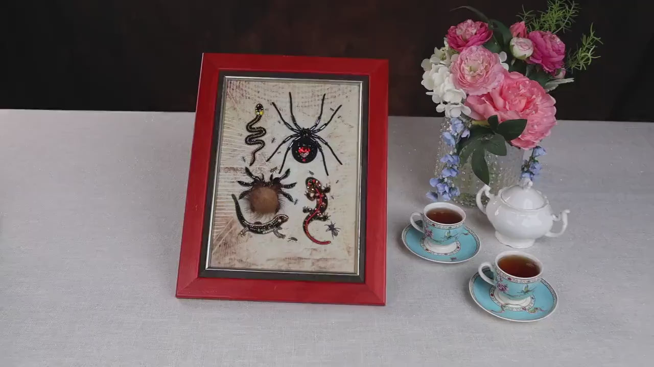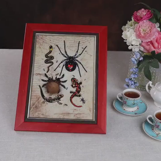 This handcrafted wall art piece also offers the option to purchase individual brooches featuring the spiders, snake, or lizards separately, allowing you to extend your collection or create unique gifts. Once completed, we suggest stretching your finished work carefully before framing to preserve its shape and enhance its presentation.