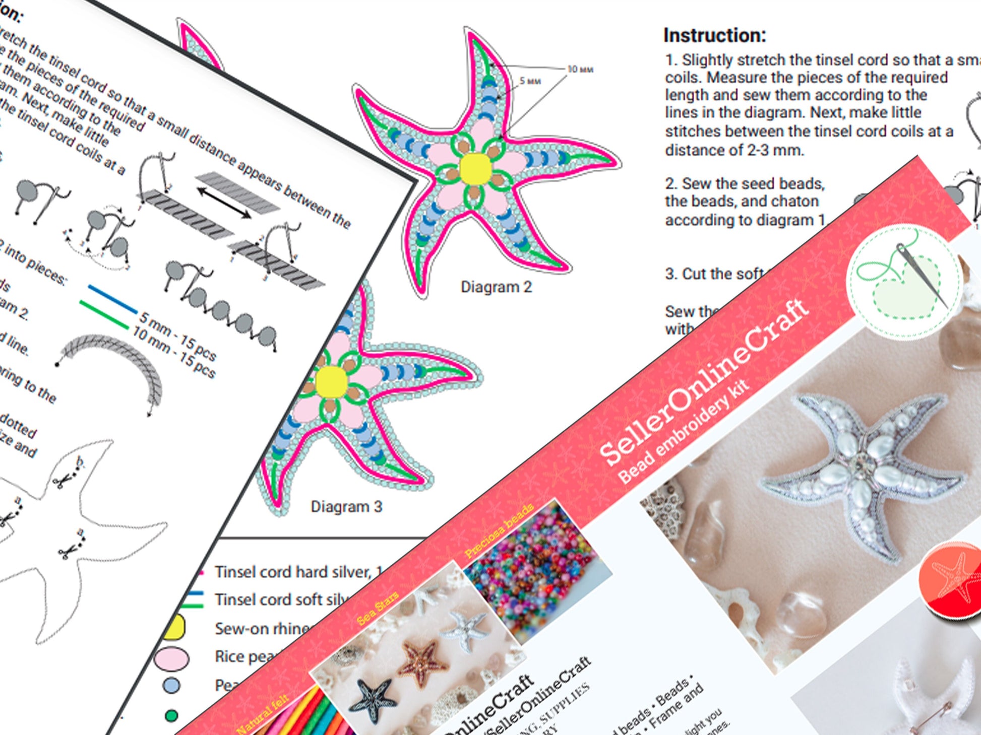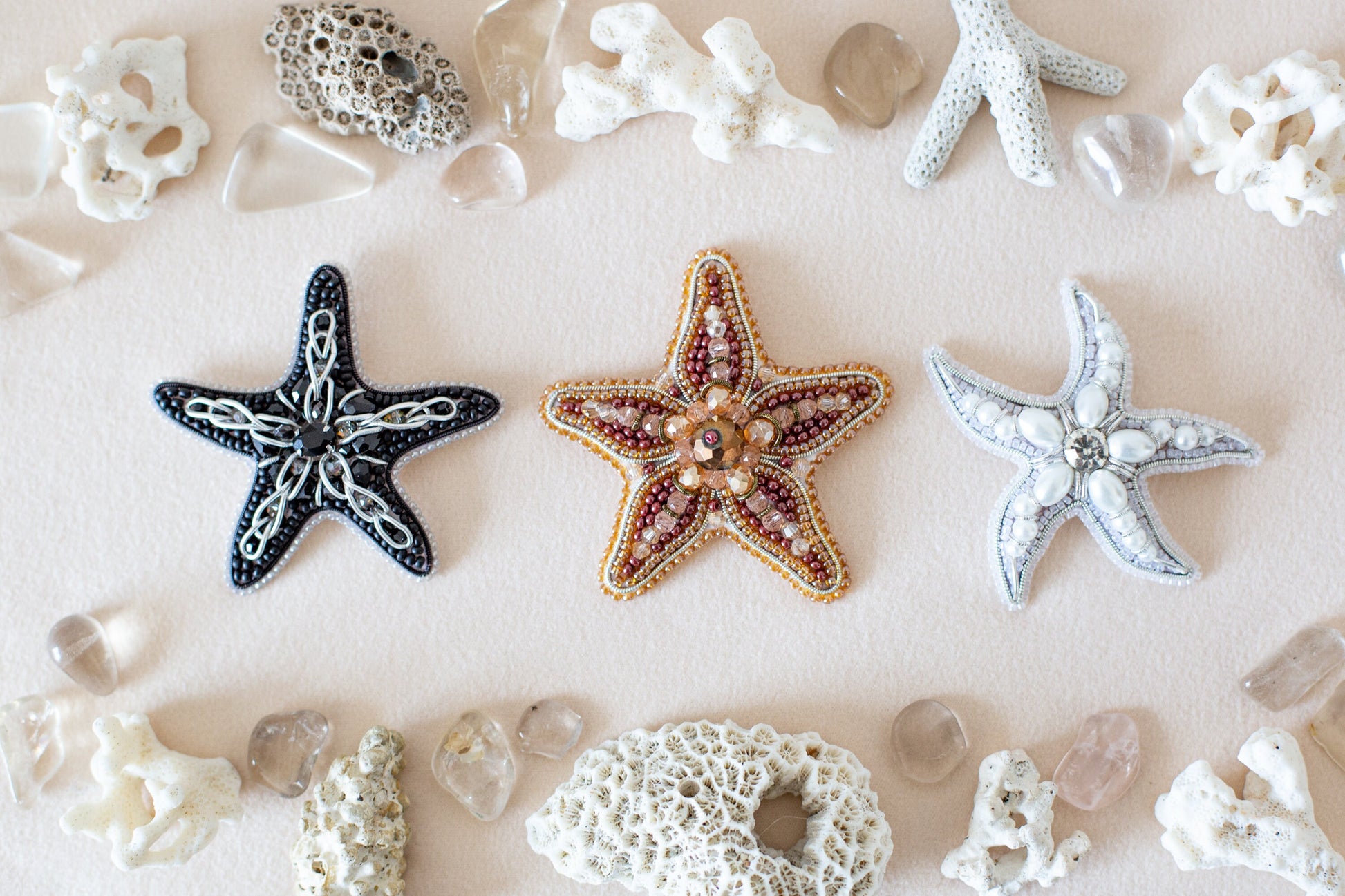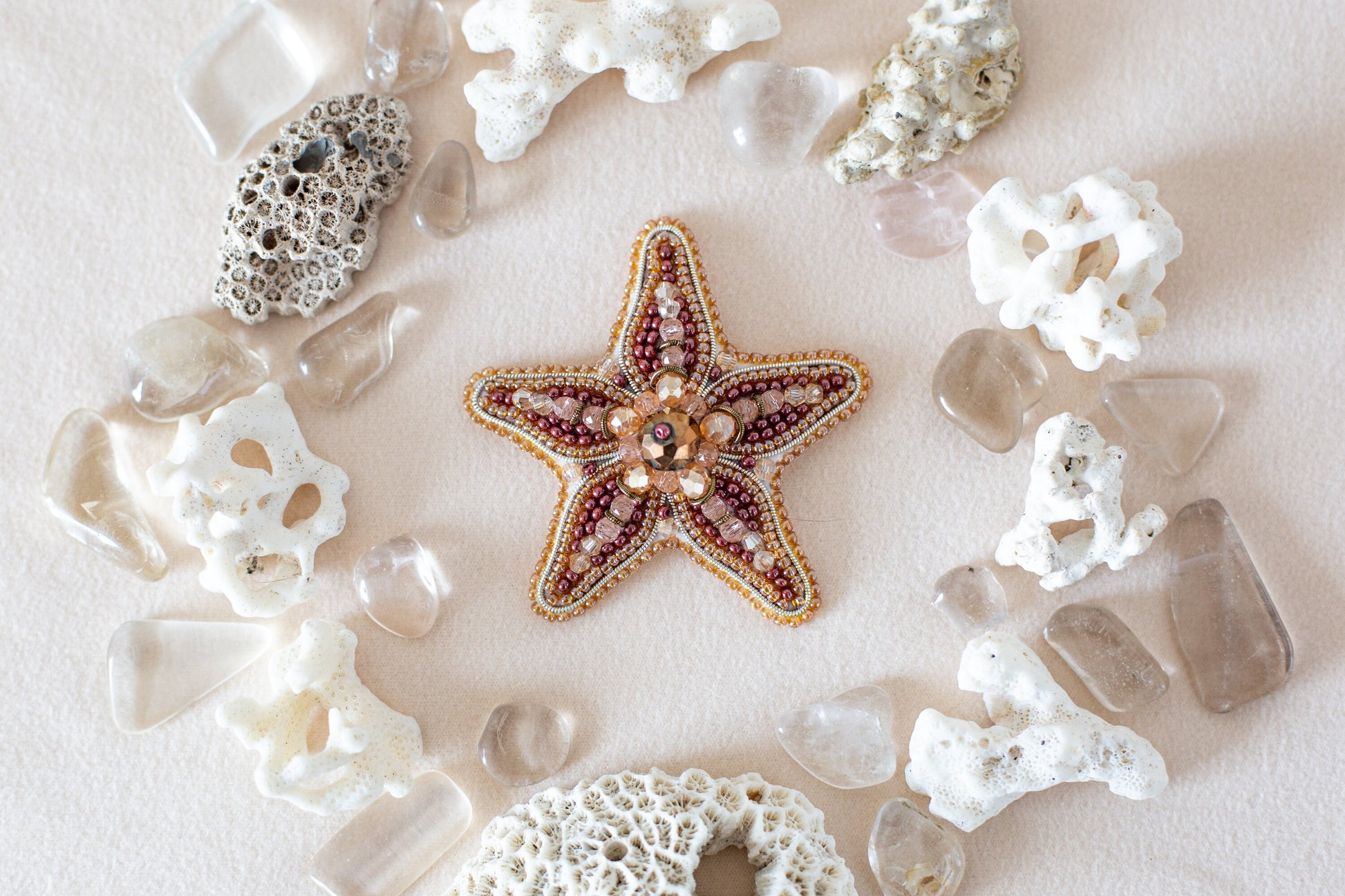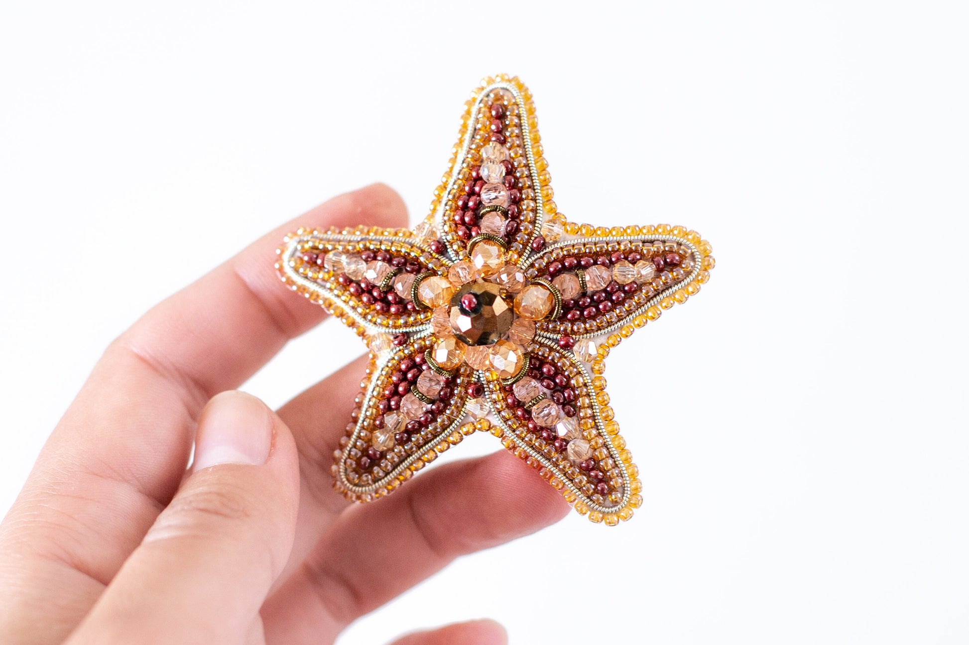 Create a stunning starfish brooch with your own hands with our jewelry-making kit for beginners. Our beadwork kit will help embroider a gorgeous starfish brooch or pendant while practicing different bead embroidery techniques: embroidery with seed beads and beads and decoration with a tinsel cord.