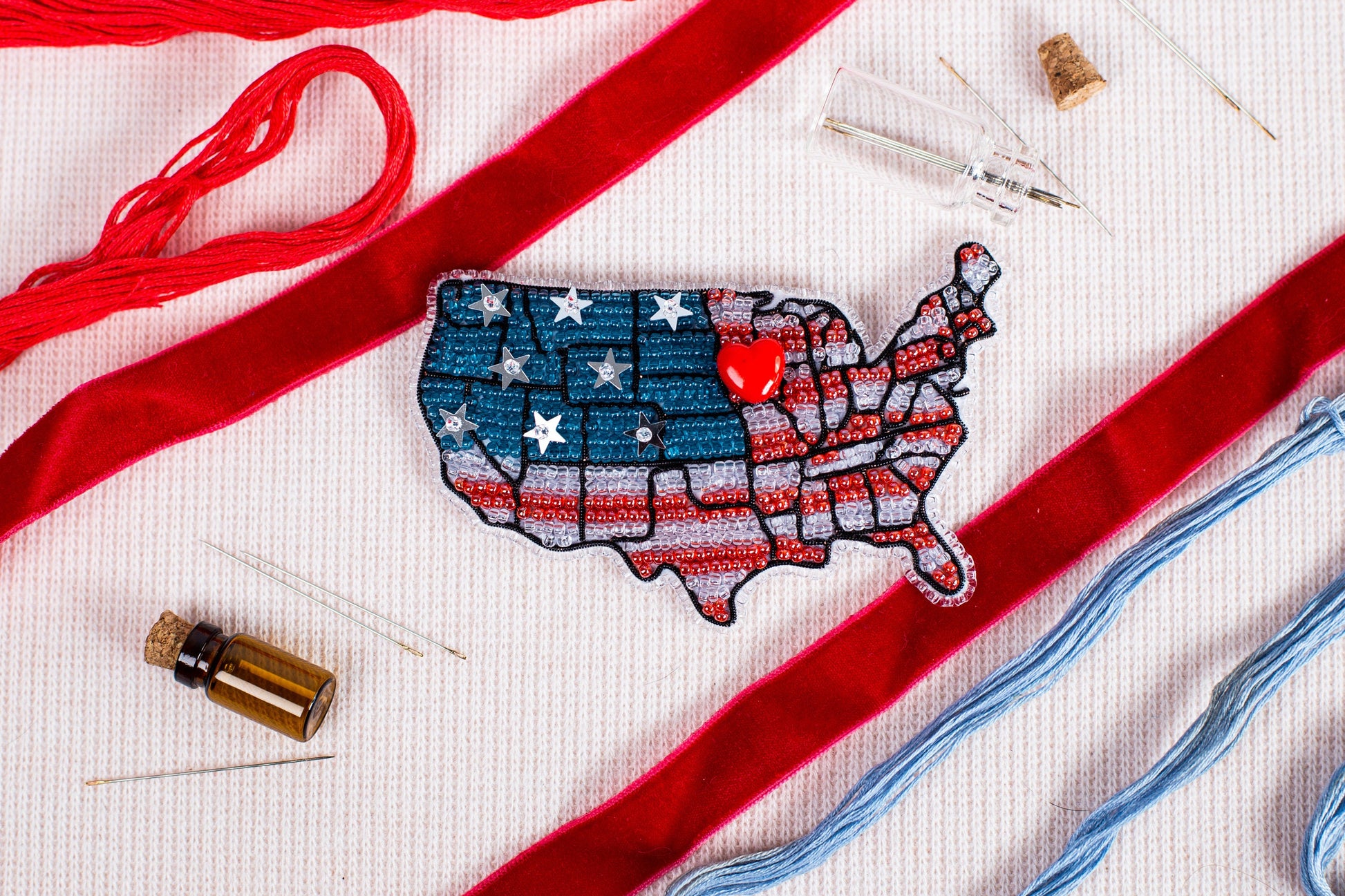 Try our DIY craft kit - bead embroidery kit set for making a unique bead brooch kit. Unleash your creativity and patriotism with this unique and captivating bead brooch kit. Whether you're a beginner or an experienced beadwork artist, this USA map bead embroidery diy kit provides everything you need to create a stunning map-shaped USA map brooch or pendant! This eye-catching Independence day beaded brooch is a stunning piece of wearable art that pays tribute to the United States. Whether you are looking to adorn your outfit on the 4th July day or looking for the perfect handmade gift from the USA – our diy beadwork kit definitely worth some of your attention.