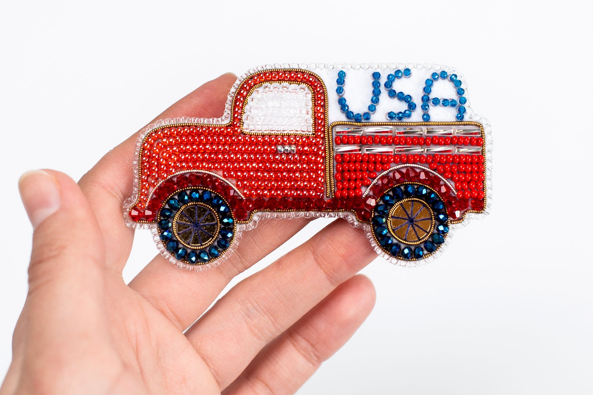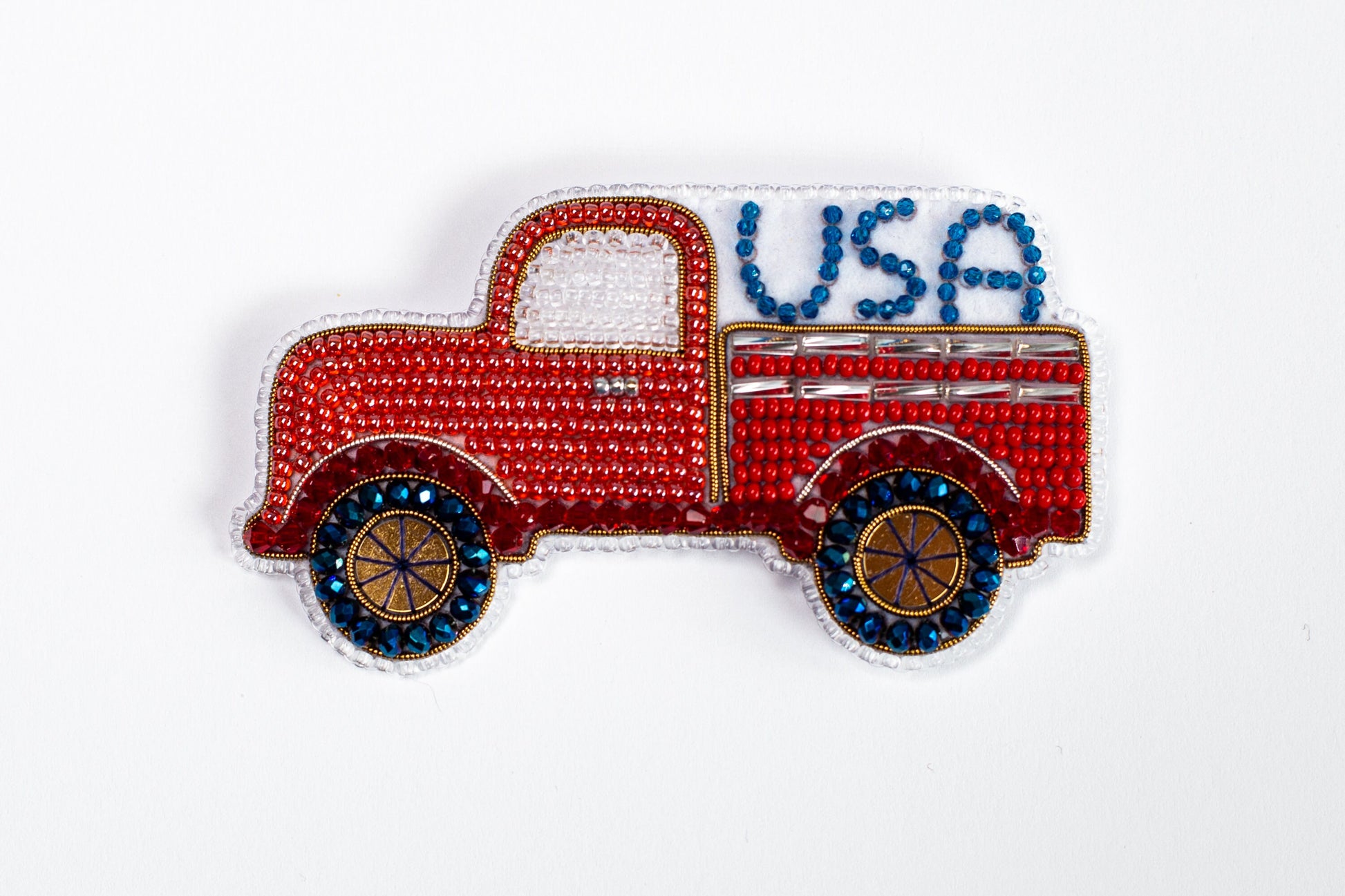 USA Red Truck Bead Embroidery Kit. DIY bead brooch. Seed Bead Brooch kit. DIY Craft kit. Beadweaving Kit. Needlework beading