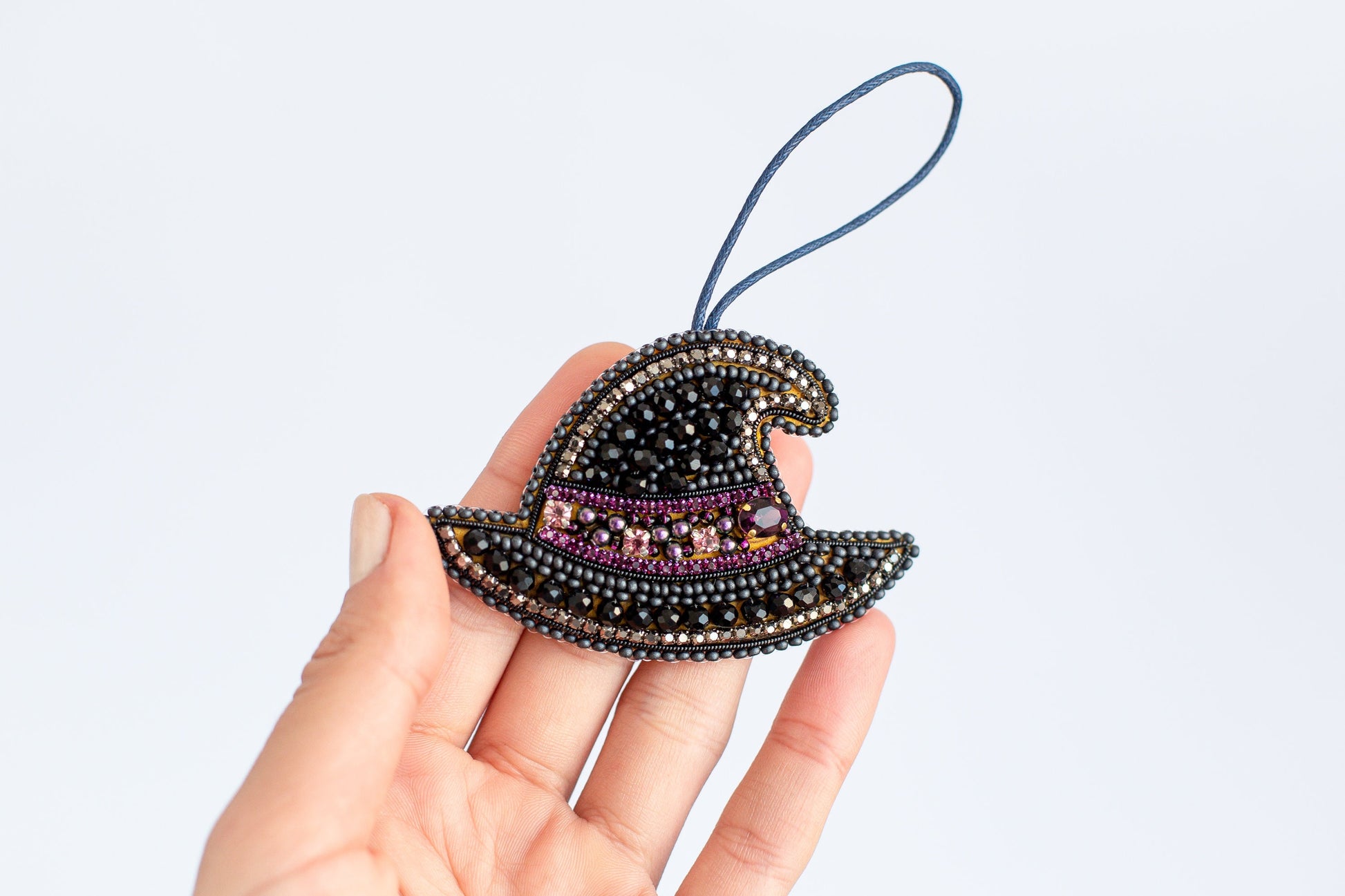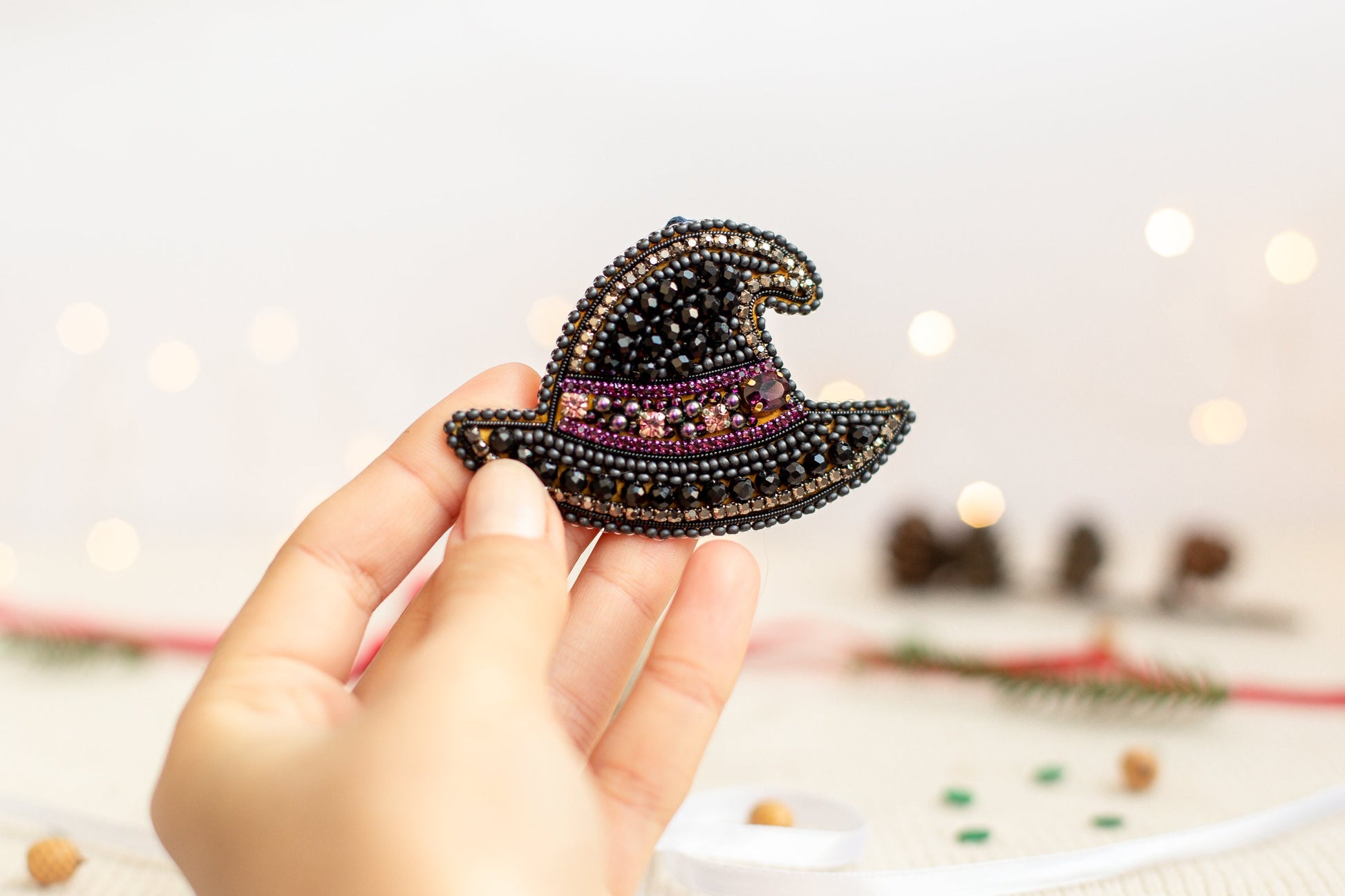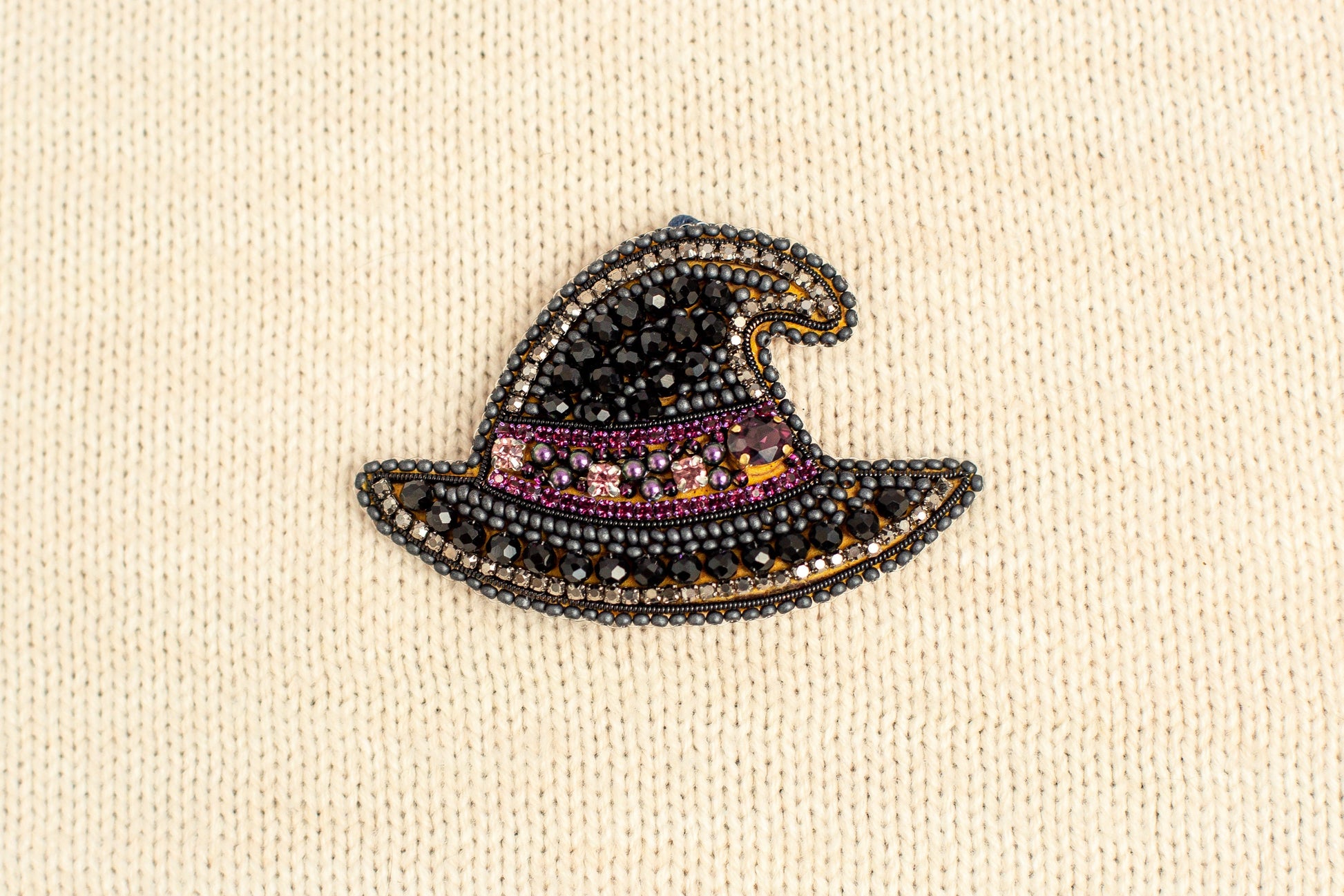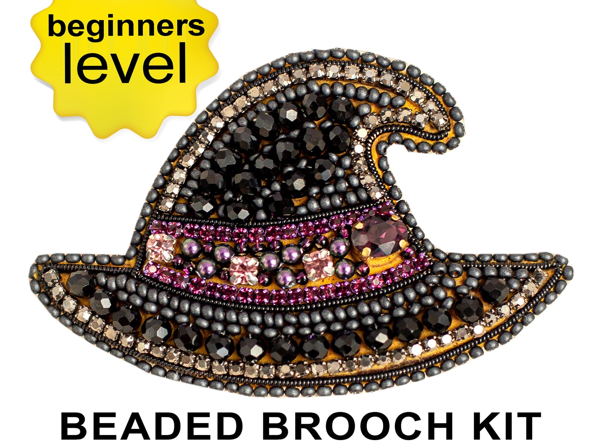 Try our DIY craft kit - bead embroidery kit set for making a unique bead brooch kit. This tutorial is all about creating a beaded witch hat brooch. With our bead embroidery kit, you can make a stunning accessory perfect for Halloween or any occasion. The black hat is made of seed beads and rhinestones, giving it an elegant and gothic look. This spooky brooch can add a touch of style to any outfit, not just during holidays. The tutorial includes step-by-step instructions on making the embroidered hat pin brooch accessible, even for those new to needlework. The kit has a bead embroidery pattern, detailed instructions, and all the necessary materials.